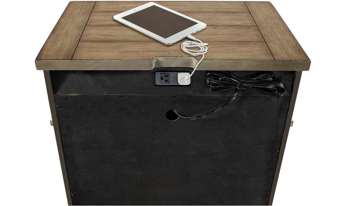 Includes dual canted AC outlets on back and hidden storage drawer