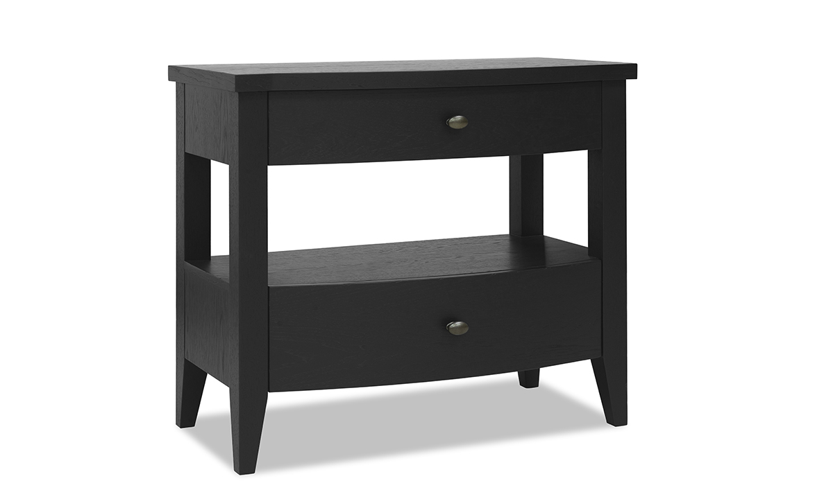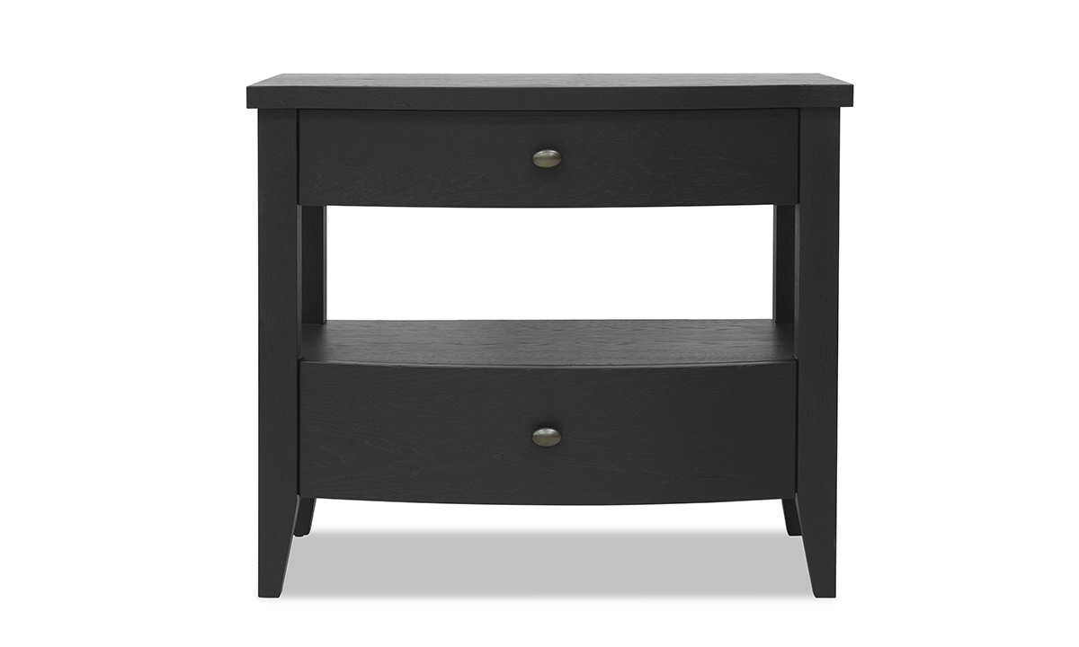 Upgrade your bedroom with our 2 Drawer Open Nightstand, featuring English dovetail joints. Made from hardwood solids and veneers with a Blacksmith finish. Available at discount furniture prices.