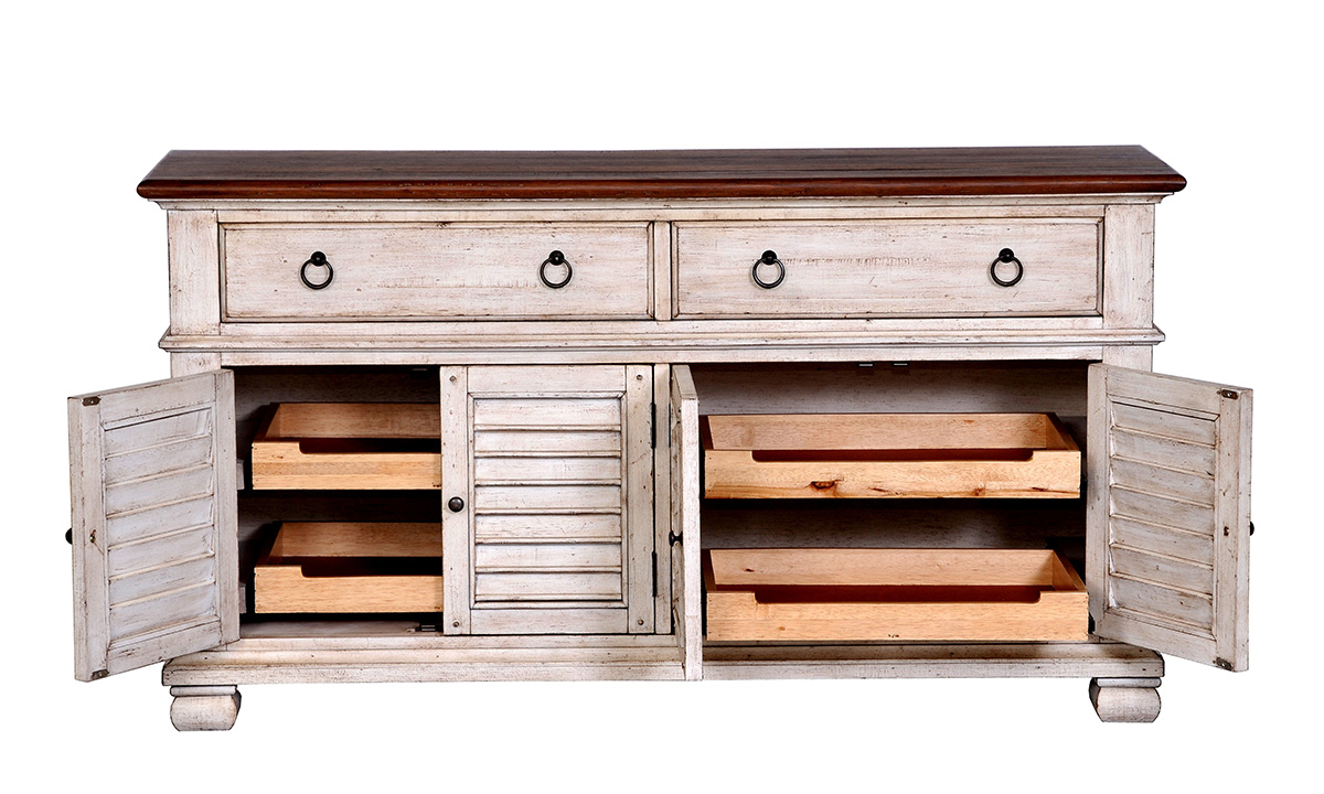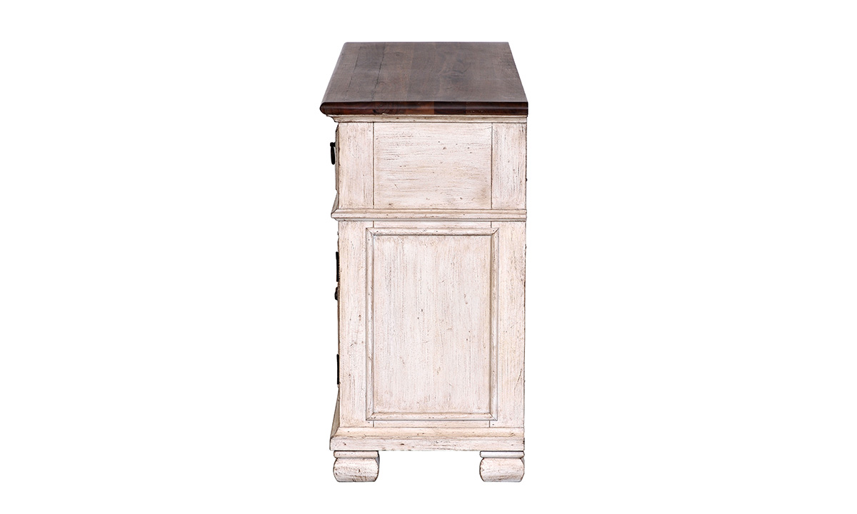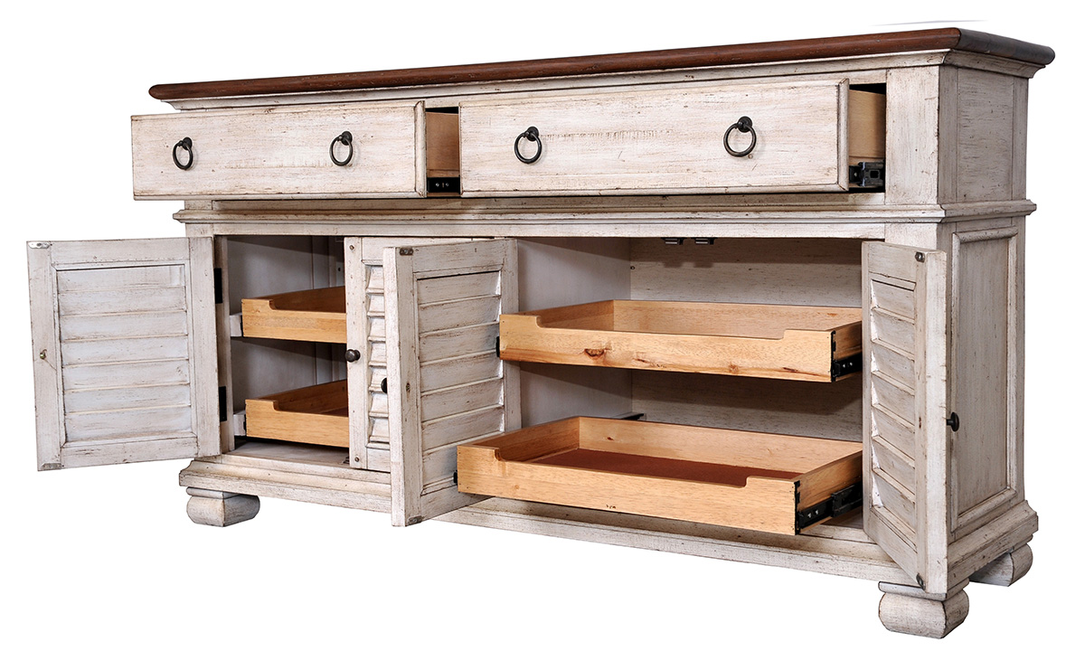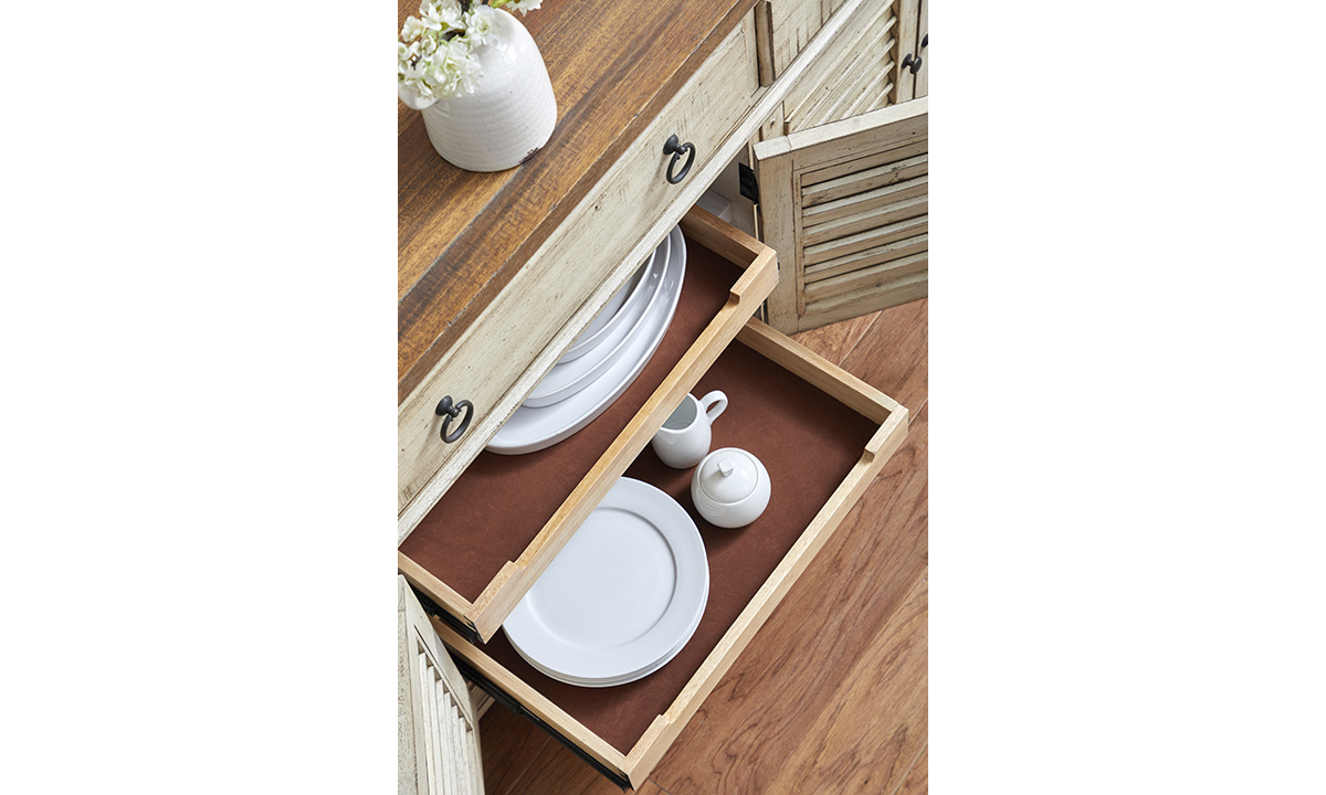 The Belmont Antique Linen 4-Door Buffet is a stunning storage solution, designed to blend seamlessly into a range of interior designs while providing functional storage space. Coated in an alluring dual-tone finish of timbered brown and antique linen, the buffet breathes an air of subtle elegance, effortlessly enhancing the aesthetic appeal of your dining area or living room. Constructed meticulously from the high-quality Sengon Tekik hardwoods, the buffet not only embodies visual appeal but also durability and robustness. These premium hardwoods ensure the piece withstands the test of time, while the intricate English dovetail joinery contributes further to its solidity and strength. Each drawer within the buffet is delicately lined with aromatic Red Tennessee Cedar, adding an unexpected yet pleasant sensory experience upon use. Beyond its aesthetic allure and construction quality, the Belmont Buffet is a haven of storage convenience with its four doors and two drawers, offering abundant space for your cherished dinnerware, linens, or other valuable items. Its expansive surface can also serve as a display area for your favorite decor pieces, making it a functional and stylish addition to your home.