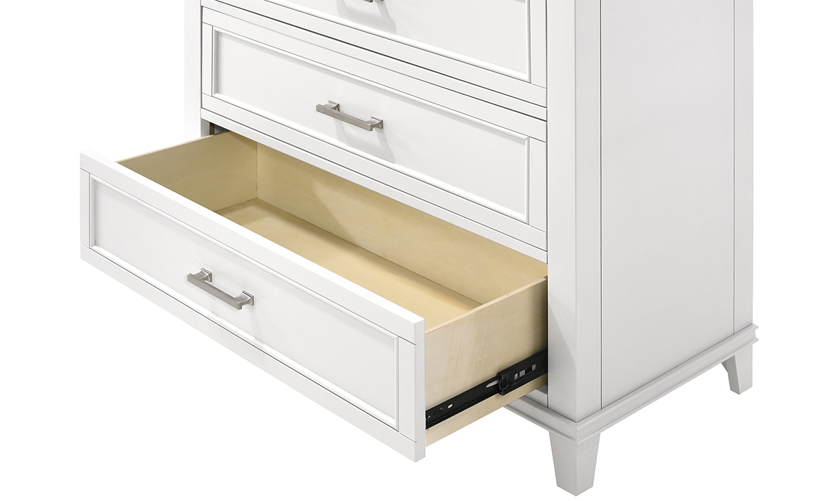 Equipped with five large storage drawers, this chest provides ample space to keep your clothes, accessories, and other belongings organized and easily accessible. The smooth ball bearing drawer guides ensure effortless opening and closing of the drawers, allowing for smooth and quiet operation. Whether you need extra storage space for your clothing, linens, or personal items, the Waterpointe White 5-Drawer Chest offers the perfect solution. Its spacious drawers offer versatility in storage, allowing you to neatly arrange and categorize your belongings. With its combination of style, functionality, and durability, the Waterpointe White 5-Drawer Chest is a practical addition to any bedroom. It not only provides ample storage space but also enhances the overall aesthetic of your room. Choose the Waterpointe White 5-Drawer Chest to elevate your bedroom organization and bring a touch of elegance to your space. Experience the convenience of easy-to-access storage and enjoy the enduring beauty of this timeless piece.