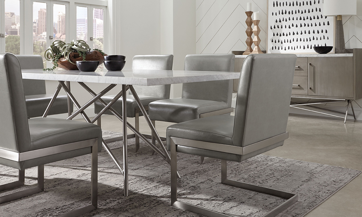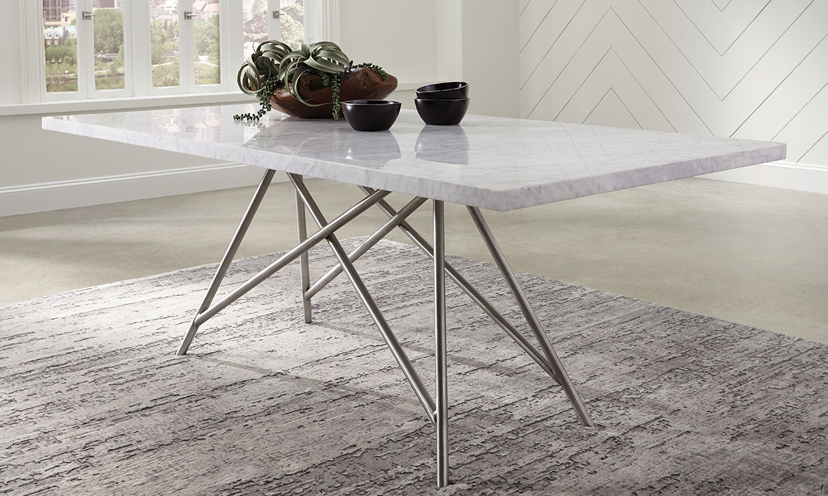 Crafted from from hand-cut-and-welded stainless steel tubing, these luxury dining room sets include a marble dining table and four chairs in a cool, Coral Gray.