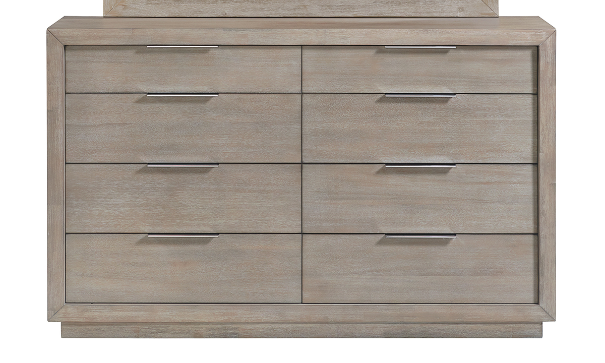 Explore our Perry wide dresser in fog gray, featuring cedar-lined bottom and felt-lined top drawers, crafted from Acacia solids for lasting elegance. With 8 drawers, it maximizes space while ensuring style.