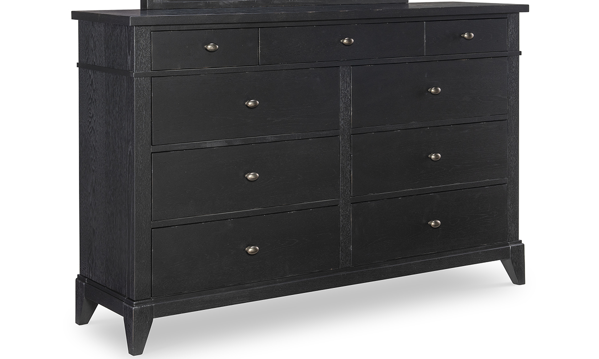 See our 9 Drawer Dresser, featuring side-mounted metal ball bearing guides and English dovetail fronts and backs. Made from hardwood solids with a Blacksmith finish, available at our bedroom outlet.