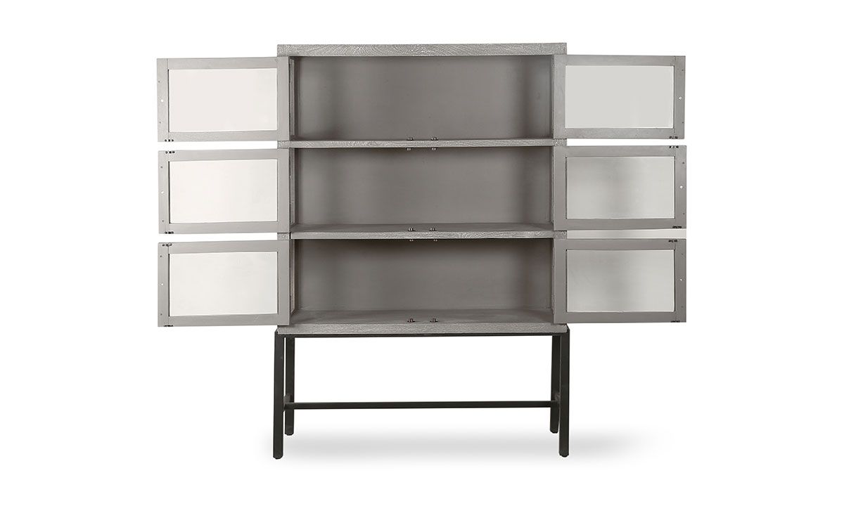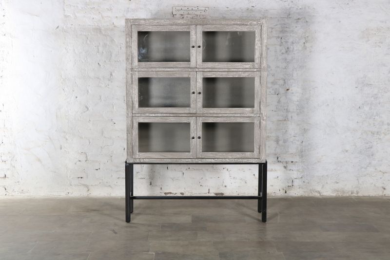 The Godaveri, a coastal contemporary and warehouse mix, was made to showcase your top treasures and antique store finds. Made by skilled artisans, the roomy solid mango wood and glass door combo with black iron legs, was sandblasted with a grey wash finish to give it that reclaimed, repurposed and unique wood feel.