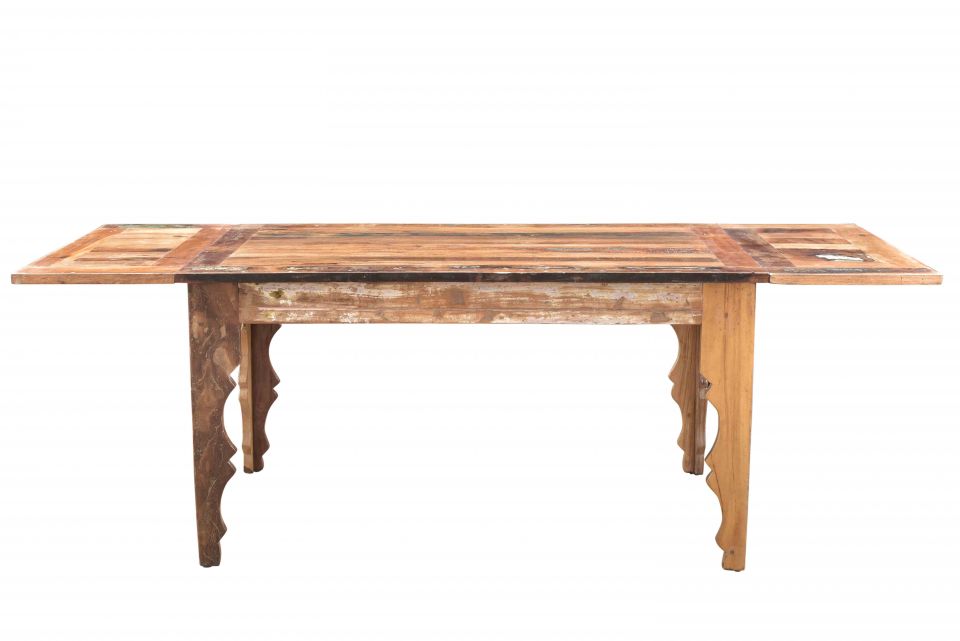 The Lotus Collection brings historic Indian architecture back to life with the Bali dining table. This 55-inch piece is crafted in India by a single skilled artisan using recycled teak and other reclaimed solid woods. Two removable leaves increase the surface space to 87 inches, showcasing the wood’s unique weathering and distressing above sculptural legs.