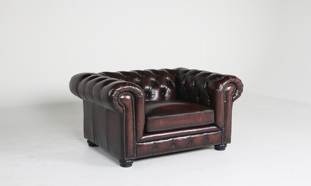Make room for rich looking and low pricing with the factory direct and timeless Chesterfield style armchair made from brown top grain leather with vinyl match back and outer sides, roll arm design, nail head trim and rubber wood legs.