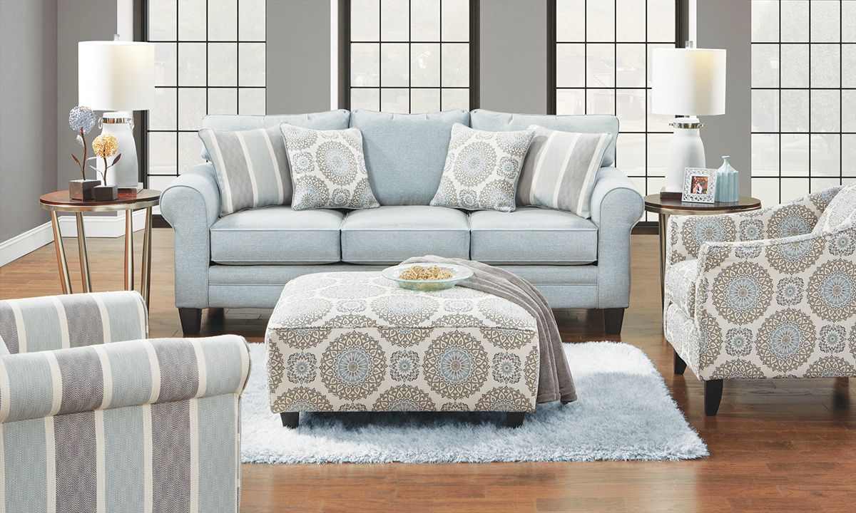 Lively 65-inch loveseat featuring contemporary light blue upholstery and four coordinating throw pillows. Handmade in America for top-quality durability.