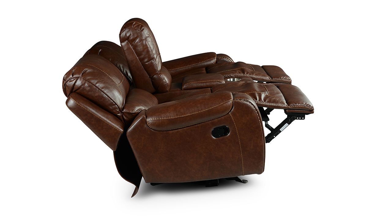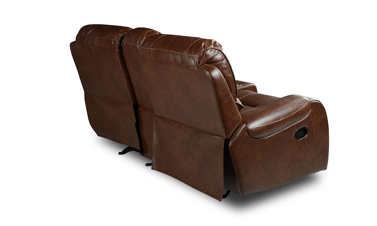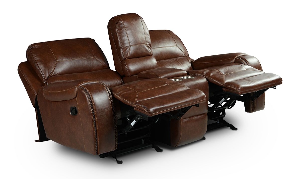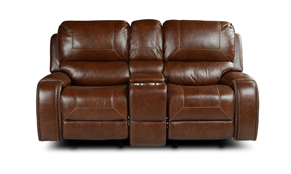 Upgrade your living room or home theatre ensemble with the superior comfort and unforgettable style of the Caspian Brown double Reclining Console Loveseat. A perfect balance of form and function, this spacious 77.5-inch wide loveseat features warm brown leather-look fabric upholstery tailored in unique baseball stitch accents and antiqued brass nail head trim. A central storage console features a spacious storage cavity, two cupholders, power outlets and two USB charging ports to keep all your entertainment essentials close at hand.