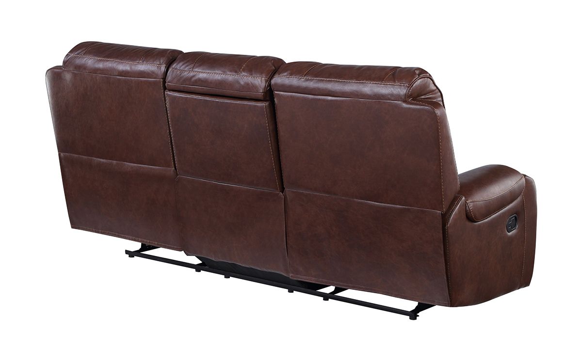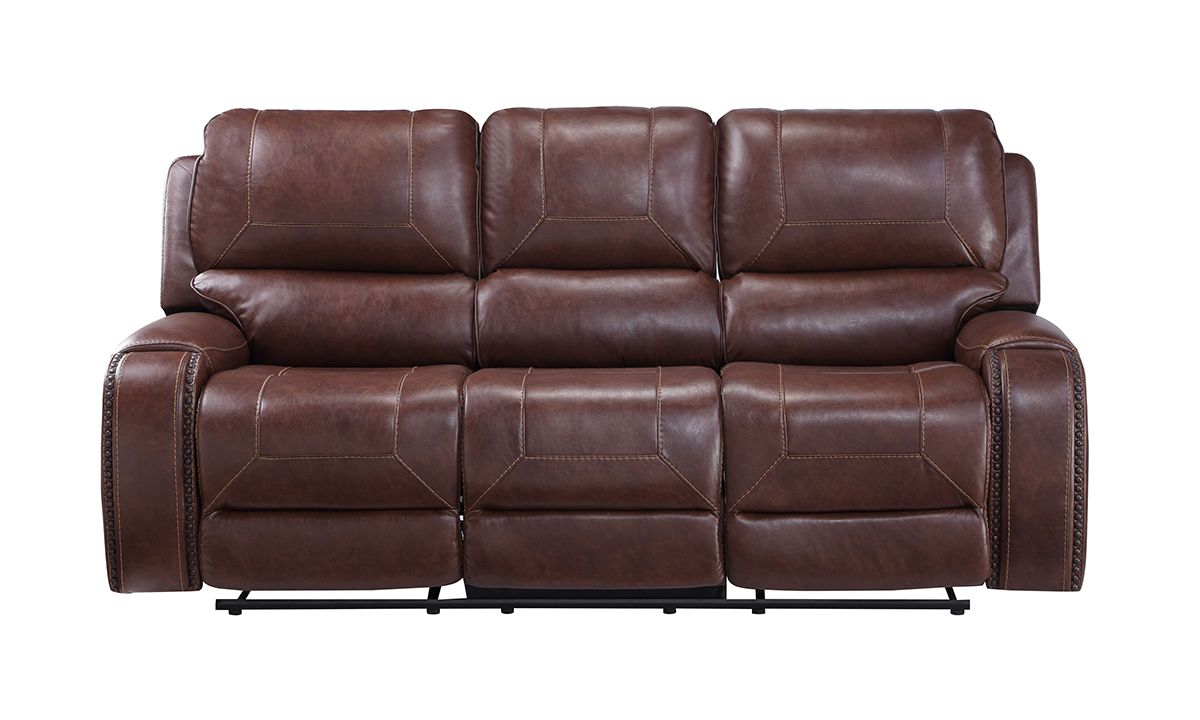 Upgrade your living room relaxation levels with the superior comfort and unforgettable style of the Caspian Brown Reclining Sofa with Drop Down Table. A perfect balance of form and function, this spacious 86-inch wide sofa features warm brown leather-look fabric upholstery tailored in unique baseball stitch accents and antiqued brass nail head trim. A central drop-down table in between the two manual recliners includes two cupholders, a wood grain table surface, storage pouch and pop-up power station with two power outlets and two USB charging ports for the ultimate entertainment station.