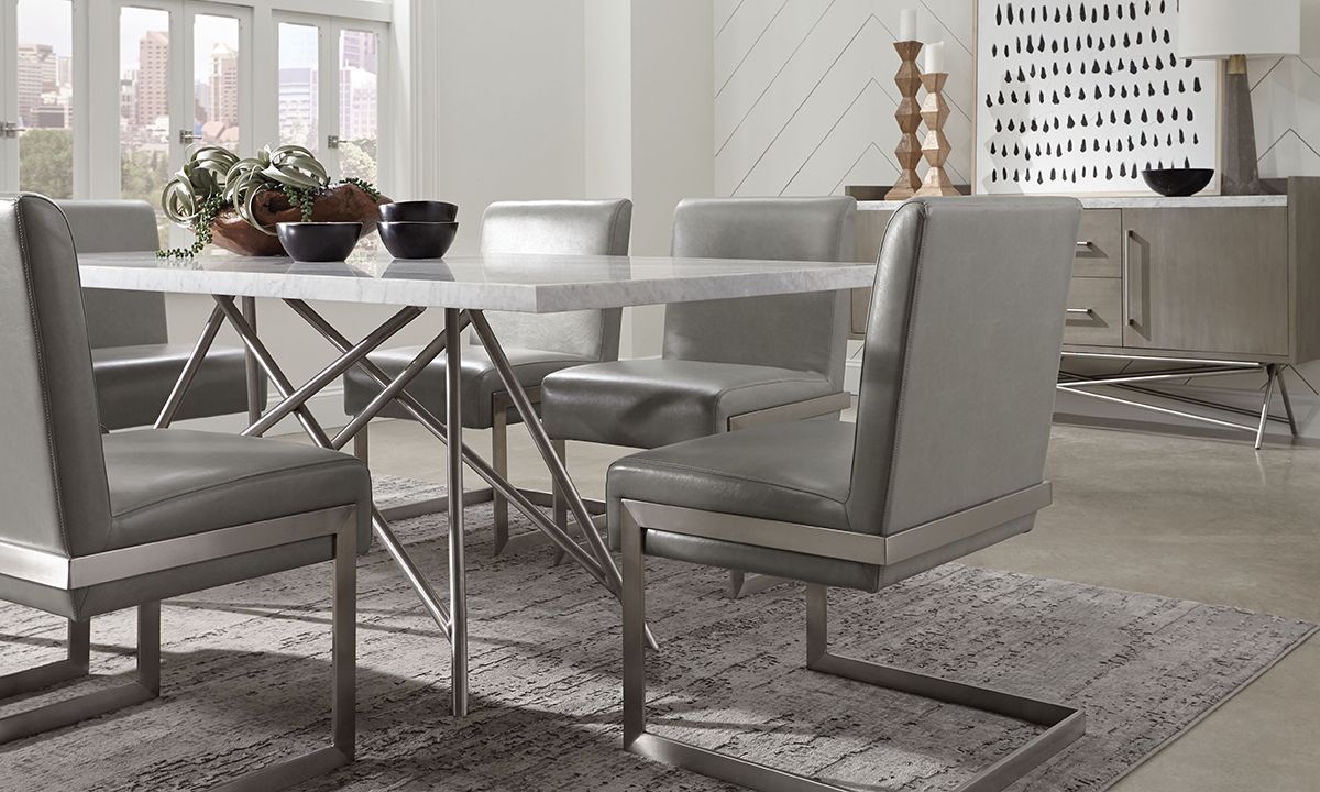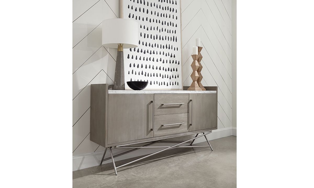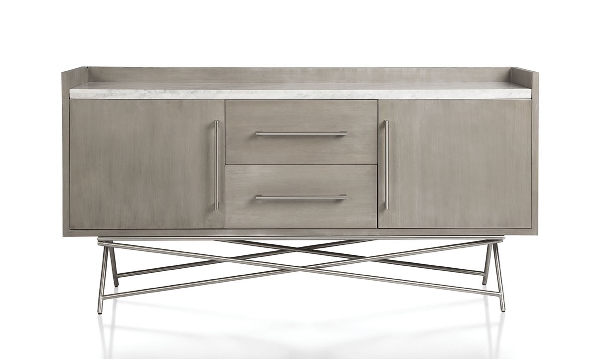 Modern design meets versatile functionality with the Coral Carrara Marble Sideboard. A welcome addition to a dining room, entryway or as a media console, this striking 72-inch wide sideboard marries sculptural styling with high-end materials to stunning effect. A striking, architectural base, hand-cut and welded from stainless steel tubes is tempered by a straightforward rectangular storage cabinet, complete with two spacious storage drawers flanked by open cabinets, sealed in a contemporary Camel gray wirebrushed finish. Stainless steel bar pulls echo the structural base design while the uniquely organic veining in the authentic Carrara marble top lends an elemental finishing touch to give the piece a fresh yet timeless feel that will elevate any room setting.