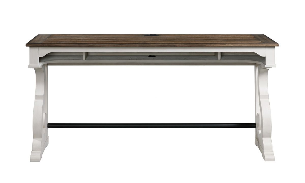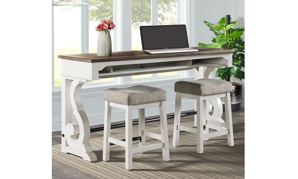 Versatile functionality meets farmhouse-inspired styling in the Drake French Oak 3-Piece Sofa Bar Set. Crafted from hardwood solids and rustic Knotty Oak veneers, the 76-inch wide sofa bar table and two barstools included in this set feature a classic, farmhouse-inspired Rustic White and French Oak wood finish and unique harp-style trestle base on the table for a one-of-a-kind look. As a practical small-space dining spot sidled up behind a living room sofa or as a multi-functional desk in the kitchen, the 76-inch wide sofa table is perfectly suited to a range of activities thanks to the built-in power outlets and USB charging port in the back panel, three spacious storage cubbies and a comfortable footrest beneath. Completing the suite, the sweet and simple 26-inch tall bar stools feature a cozy, fabric upholstered seat cushion and tubular metal footrest for added comfort.