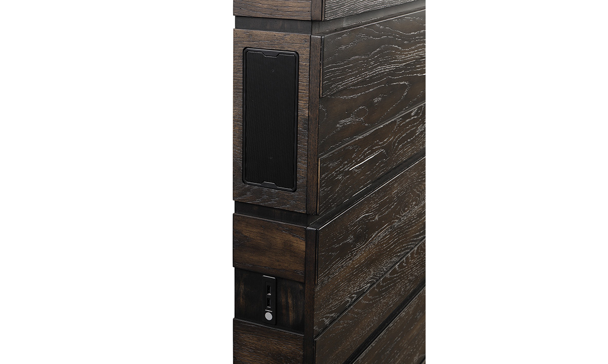 Headboard with built-in Bluetooth speakers and a subwoofer