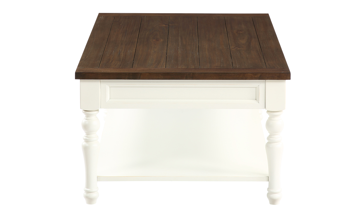 The Joanna Farmhouse Cocktail Table, with its cozy Ivory and Mocha two-tone finish, is a handcrafted beauty made from durable hardwood and Acacia veneers. Its turned legs exude farmhouse charm, while the additional bottom shelf offers extra storage for your living space essentials.