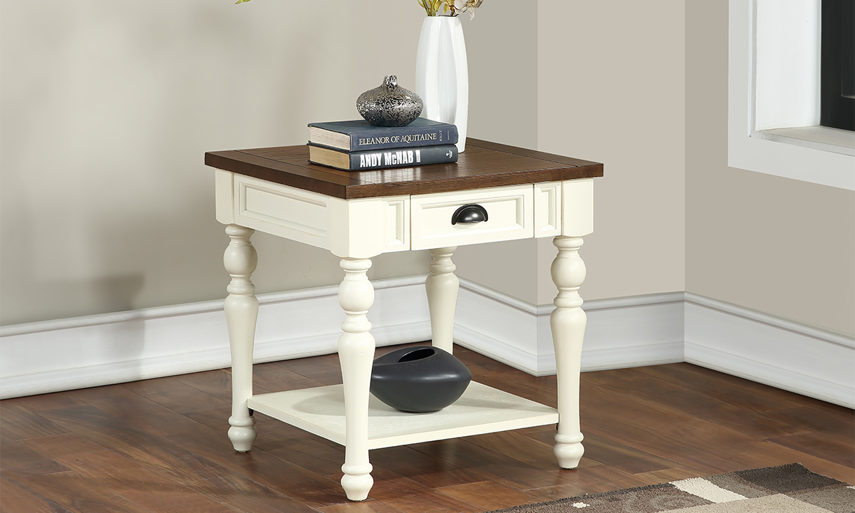 Introducing the Joanna Farmhouse End Table, a charming and practical addition to any home. The table features elegantly turned wood legs, adding a touch of classic farmhouse style to your space. Designed with functionality in mind, it includes a front drawer and a bottom shelf, providing ample storage for your living room essentials. Whether placed beside a sofa or used as a standalone piece, the Joanna Farmhouse End Table combines practicality with timeless style, making it an ideal choice for bringing a cozy, traditional feel to your living space.