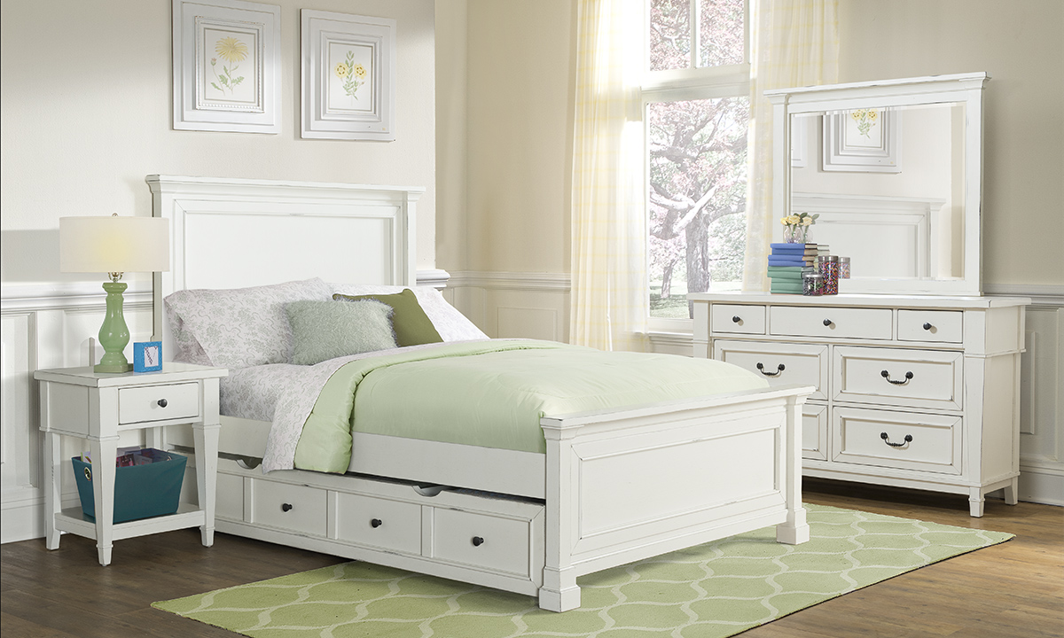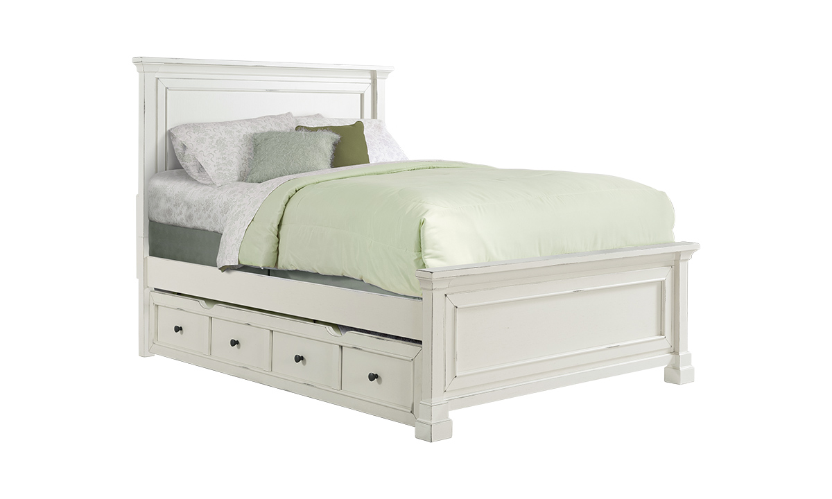 Elevate your home with the Northport White Trundle Storage, a versatile piece of luxury bedroom furniture. This unit functions both as a trundle bed or additional storage. Perfectly fitting under any bed in the collection, it's accented with antiqued, blackened metal hardware to bring modern farmhouse elegance into your space.