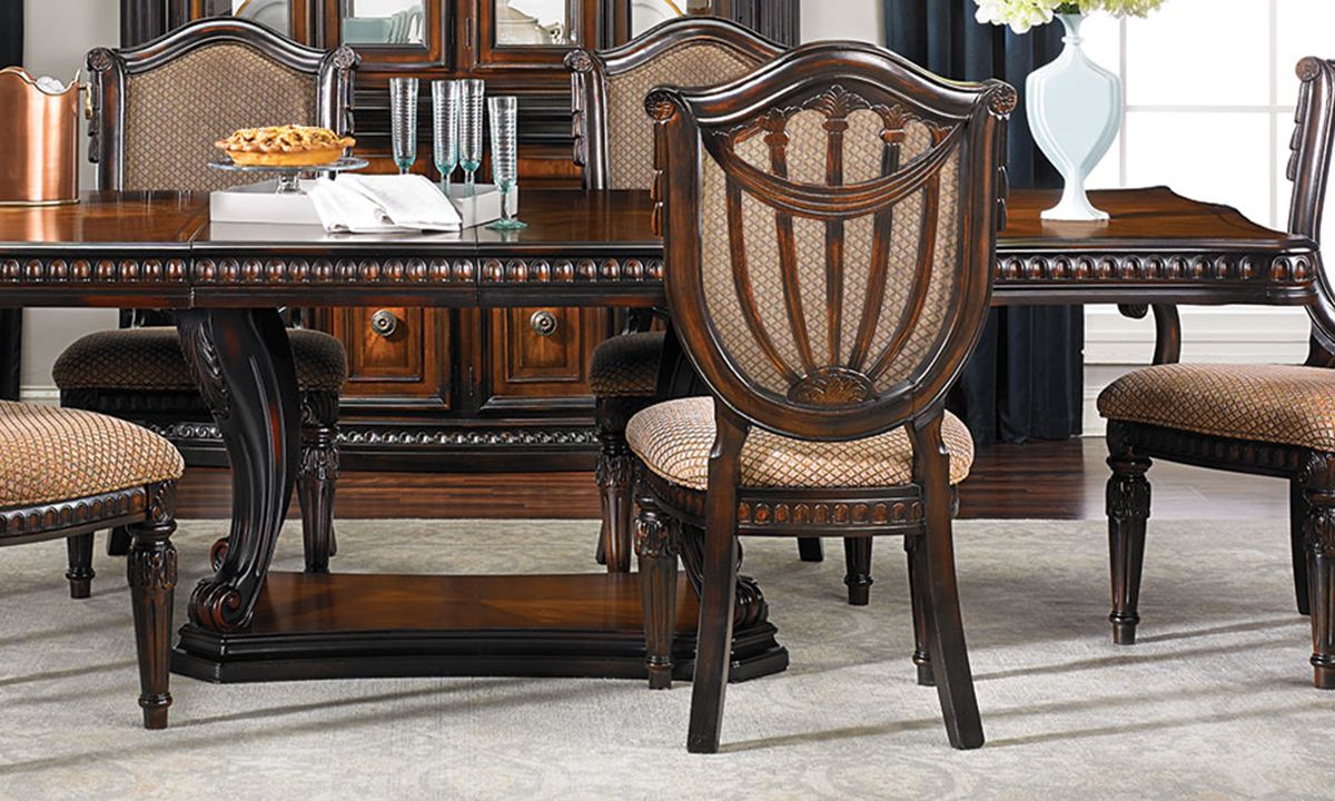 Capturing the elegant craftsmanship of old world, European designs, the Carnegie Manor II 5-Piece Dining Set with Upholstered Side Chairs breathes new life into the traditional style for an inviting look steeped in heirloom-quality sophistication. Crafted from Poplar solids and Prima Vera veneers with stunning Walnut inlays, the 60-inch round table and four armless side chairs included in the set feature a warm and welcoming Dark Cinnamon finish. A modernized take on classic old world styling, the table pairs a contemporary 5-inch thick glass top with an eye-catching pedestal base featuring Walnut panels framed in fluted pilasters leading up to four intricately carved corbels. Completing the ensemble, the four included side chairs echo the same detailed carvings found on the table and feature a fabric upholstered seat and back with a striking wood shield panel finished with a classic swag carving.