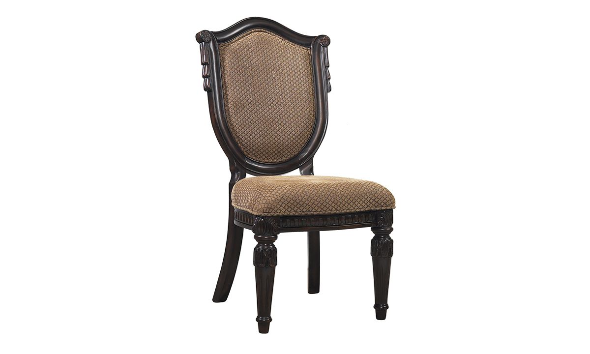 A welcome place for guests to sit back and enjoy each other’s company, the Carnegie Manor Upholstered Shield Side Chair, makes a timeless statement in any dining room ensemble. Carefully crafted from Poplar solids and Prima Vera veneers, the ornately carved wood frame of this 44-inch tall armless chair features a warm, Dark Cinnamon wood finish. Striking an elegant contrast against the delicately carved shield-back design, the cream-colored fabric upholstery covering the seat and back of the chair features a versatile diamond motif.
