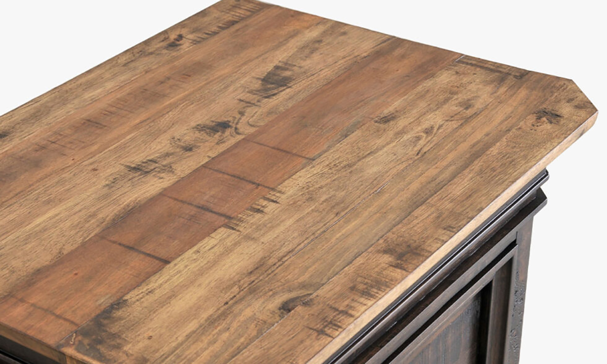 Features a lightly distressed two tone wheat and misty night finish over select hardwoods
