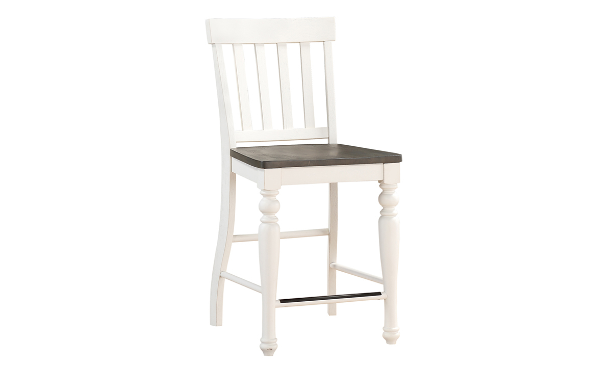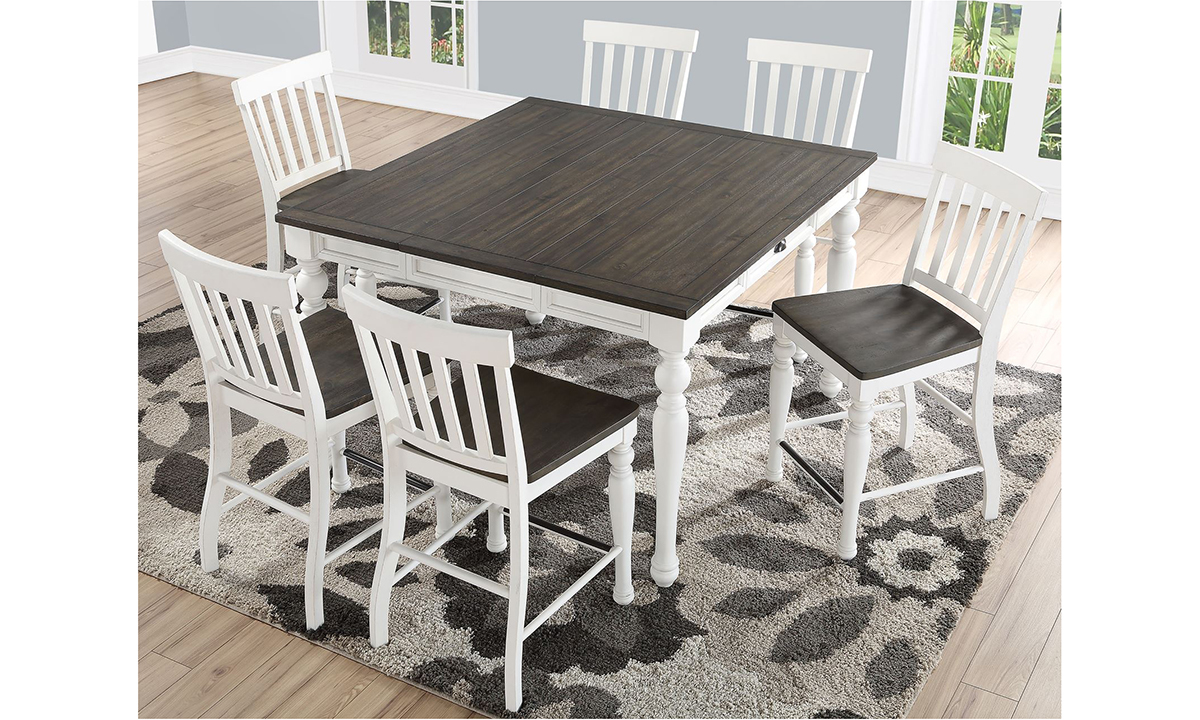 Style, versatility, character, and charm define this rustic Farmhouse Counter Height 5-Piece Dining Set including table, extension leaf and four slat-back side chairs.