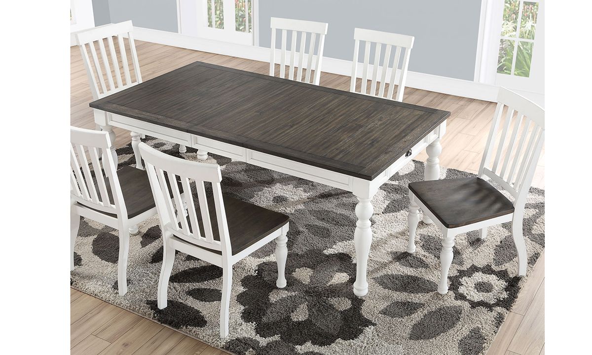 Get that charming, farmhouse-inspired look you’ve been lusting over without sacrificing modern conveniences with the Joanna Two-Tone Farmhouse Dining Table. Crafted from hardwood solids and Acacia veneers, this 30-inch tall dining table features a charming ivory picture frame apron and classic turned wood legs, as well as a single storage drawer with an apothecary-inspired cup handle. This drawer supplies a built-in storage spot to stow the table’s single 16-inch extension leaf, which allows the mocha plank-style top to expand from 64 to 80 inches wide, perfect for effortlessly accommodating gatherings small and large.