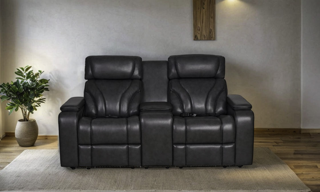 Experience ultimate relaxation with our Leather Power Console Loveseat. It offers reclining comfort with zero gravity, power headrest, air massage with heat and requires minimal space, all in chic Livorno Gray.