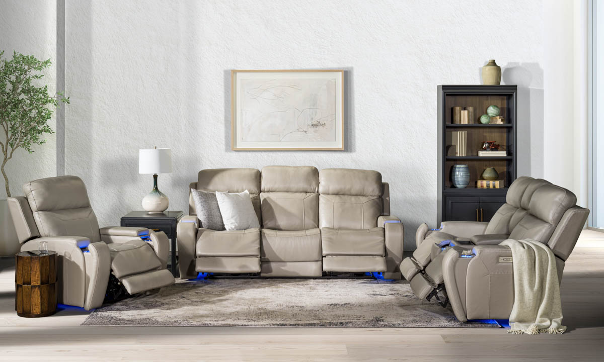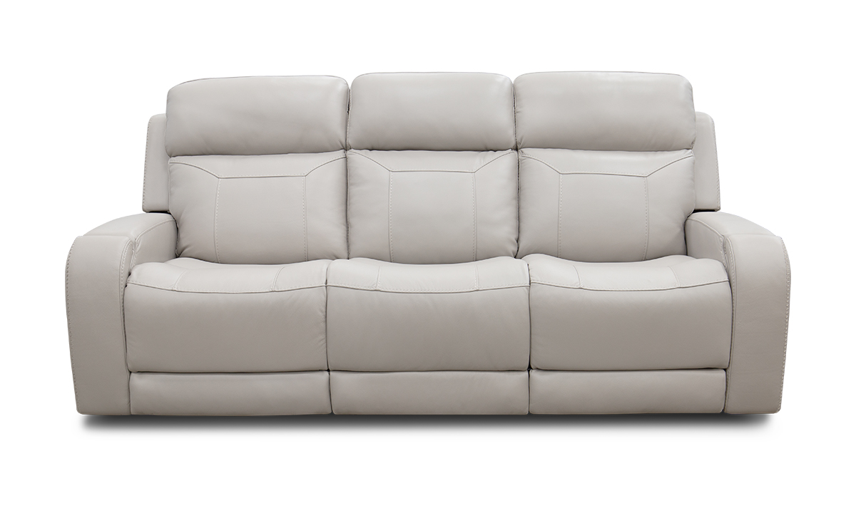 Discover the Maverick Dove Leather Sofa, featuring top grain leather with match, power headrest, footrest, and lumbar. Enjoy multimedia control with immersive sound, hidden cupholders, and a drop-down table.