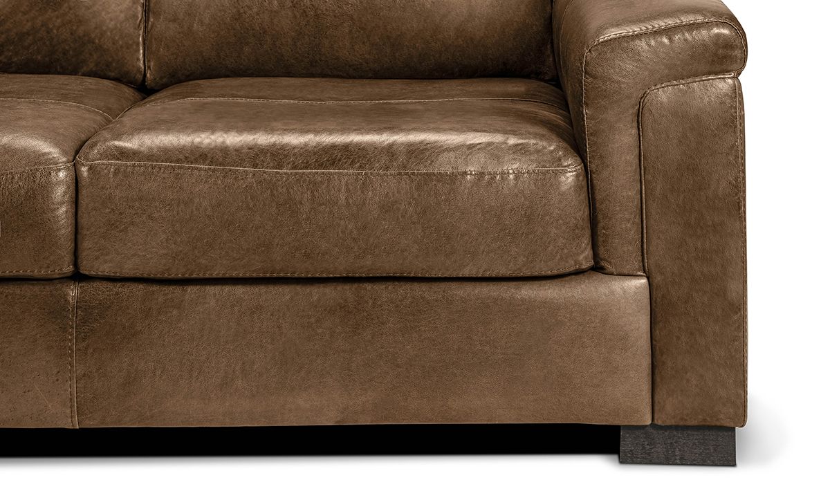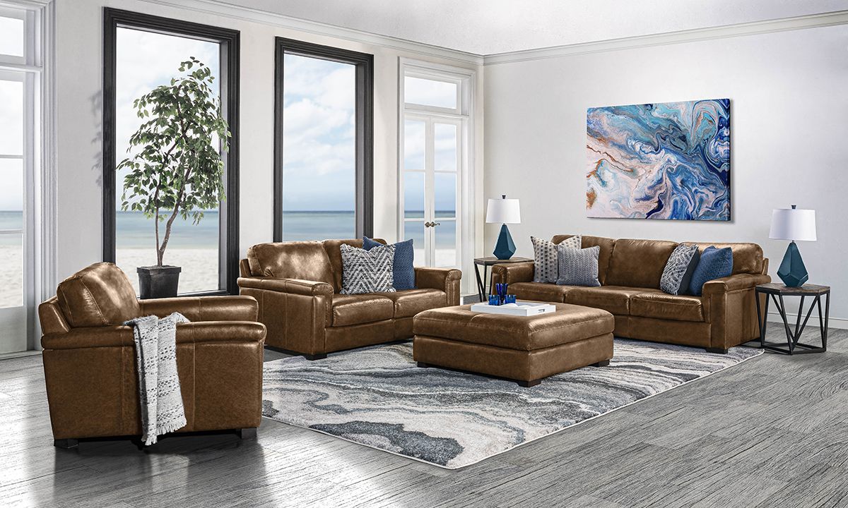 The Medici Leather Collection is available in Chestnut brown and Grey colorways. Choose from the sofa, loveseat, armchair and ottoman of the living room sets, browse our twelve most popular sectional configurations or create your own for a completely custom look.