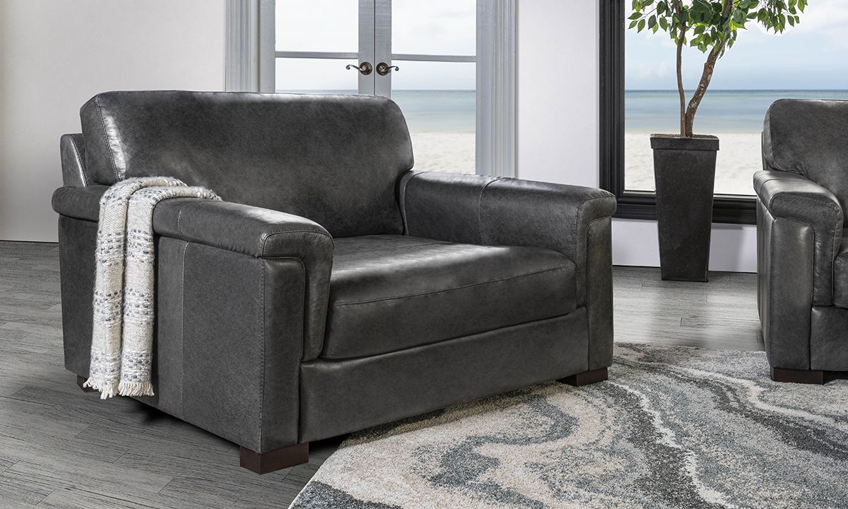 The Medici Leather Collection is available in Chestnut brown and Grey colorways. Choose from the sofa, loveseat, armchair and ottoman of the living room sets, browse our twelve most popular sectional configurations or create your own for a completely custom look.