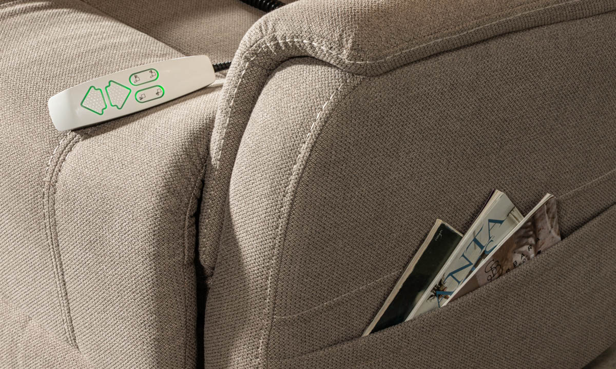 Sleek yet comfortable with narrow arm padding, the Helm Latte is loaded with conveniences such as side pockets for storing magazines and devices, handwand for USB charging and dual motors for independent control of the footrest and back of chair.