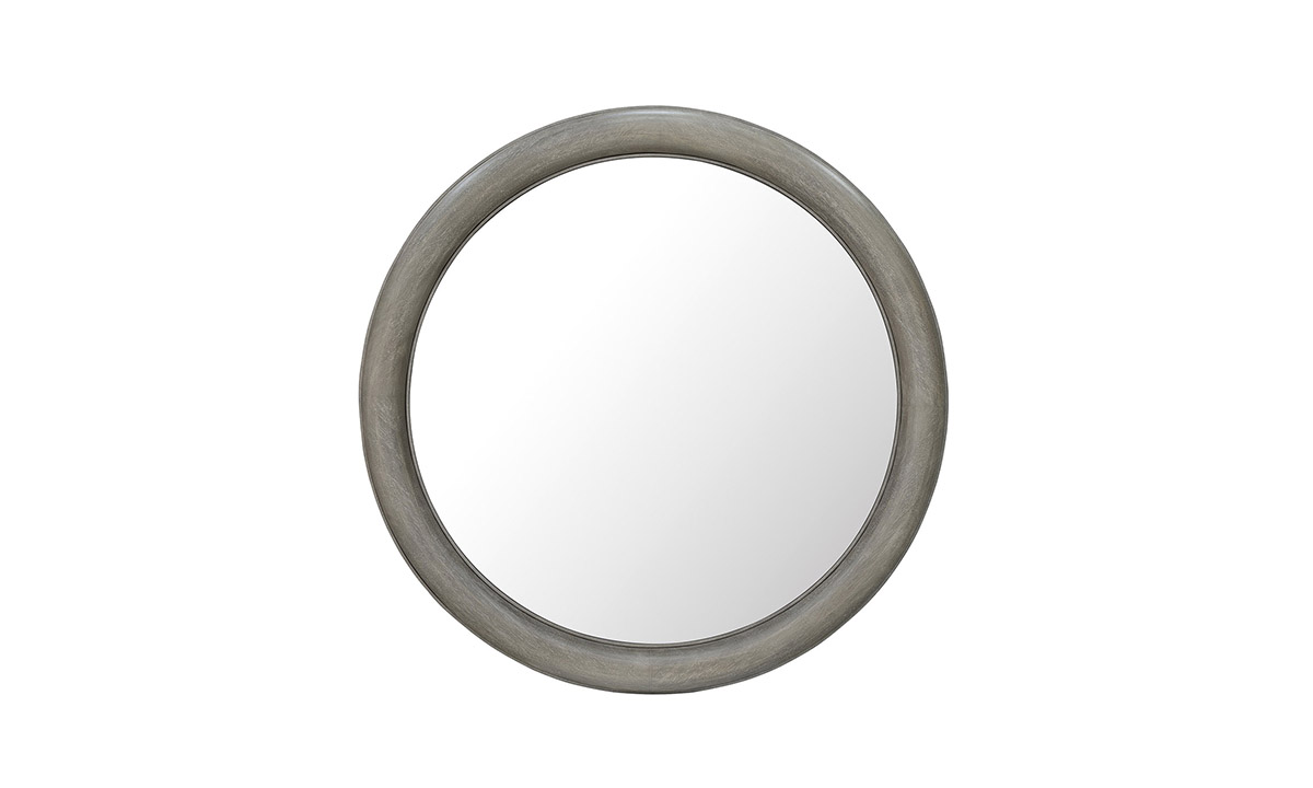 The Drew & Jonathan Griffith Smoked Oyster Mirror is a stunning addition to any king bedroom set. With a Smoked Oyster finish, Split Heart Oak veneers, and rubberwood solids, this round, modern mirror for bedroom features a beveled edge, adding elegance and style to your space.