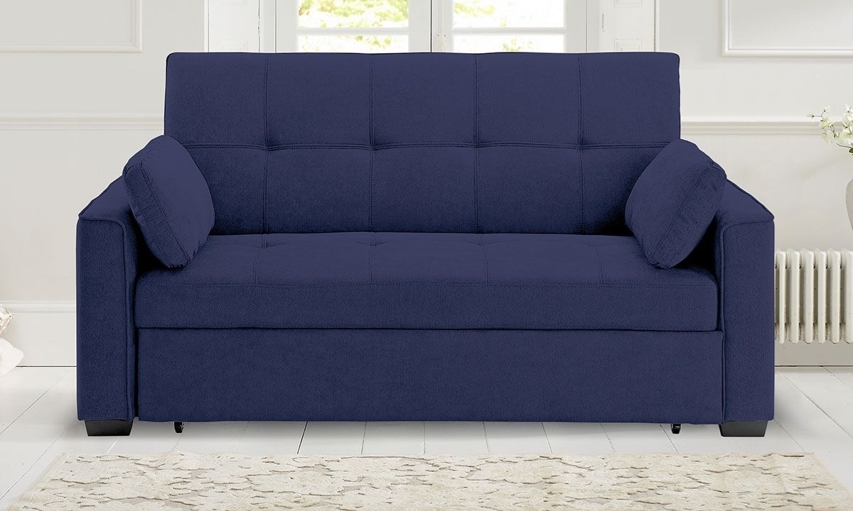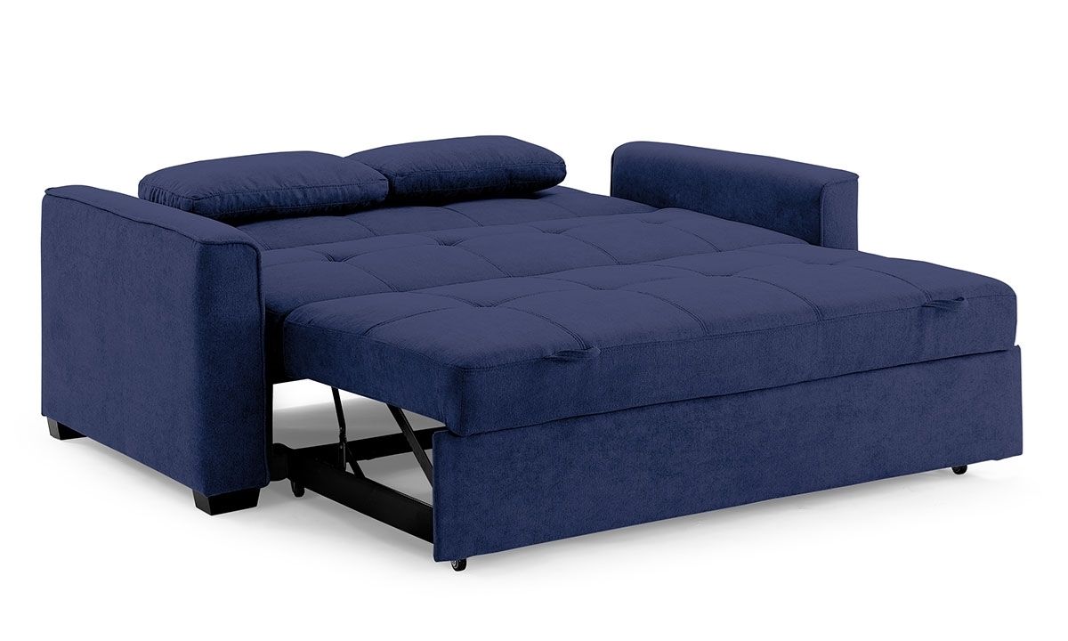 Form, function and fun await when you add the Nantucket sleeper sofa to your living space. Encompassed within the contemporary silhouette of the sofa is the pocket-coil innerspring support system wrapped in high-density foam cushions and soft, easy-clean navy micro-suede upholstery. Clean, angular lines and stylish tufting define the look of this polished piece and conceal the hidden sleeper functionality, which can be easily accessed by the two pull handles at front and slide forward to reveal a cushioned platform that pops up and sits flush with the existing sofa seat. The sofa back also reclines backward into a lounging position for optimal TV viewing or comfortable reading and lays flat to create a queen-size bed with the pop-up platform. Perfect for sprawling out during movie nights or as an extra comfortable sleeping space for guests, this sofa is a clever, appealing addition to any space.