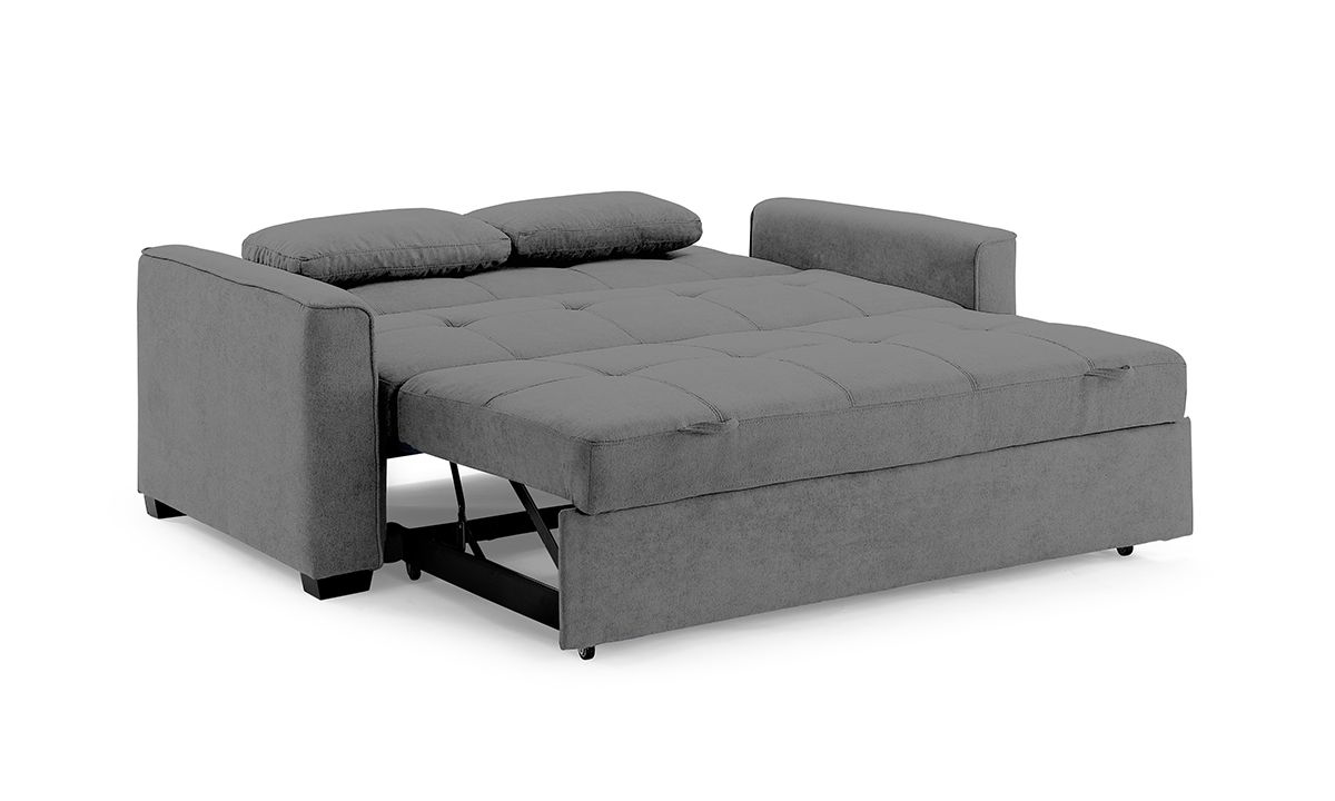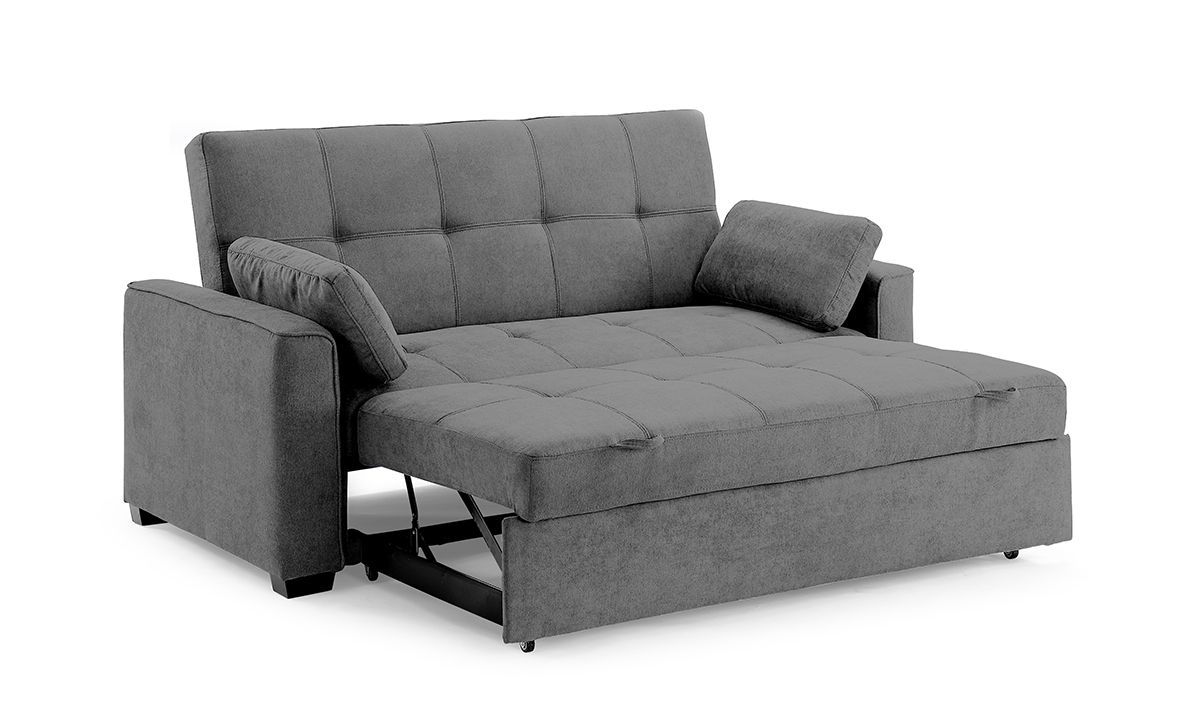Form, function and fun await when you add the Nantucket sleeper sofa to your living space. Encompassed within the contemporary silhouette of the sofa is the pocket-coil innerspring support system wrapped in high-density foam cushions and soft, easy-clean charcoal micro-suede upholstery. Clean, angular lines and stylish tufting define the look of this polished piece and conceal the hidden sleeper functionality, which can be easily accessed by the two pull handles at front and slide forward to reveal a cushioned platform that pops up and sits flush with the existing sofa seat. The sofa back also reclines backward into a lounging position for optimal TV viewing or comfortable reading and lays flat to create a queen-size bed with the pop-up platform. Perfect for sprawling out during movie nights or as an extra comfortable sleeping space for guests, this sofa is a clever, appealing addition to any space.