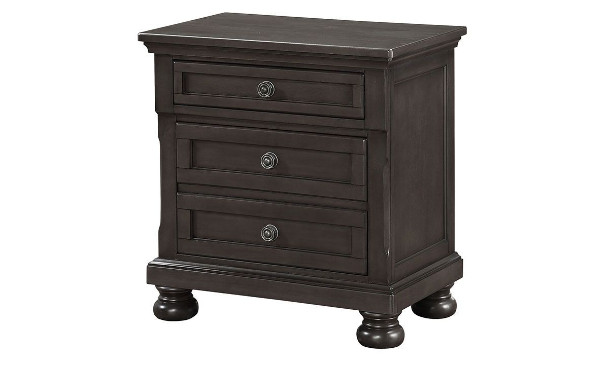 Priced just right, the Newbury Grey Mindi 2-drawer Nightstand warms your space with timeless, traditional style. It’s featured in rubberwood, poplars and pine solids with mindi veneers and a deep grey finish that complements the old-world antique bronze hardware.