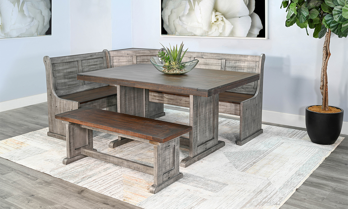 Barrel & Board’s Side Bench adds a cozy touch with it’s tobacco and gray finish and an eye catching trestle base. Versatile in nature, it can be paired seamlessly with its matching table for a complete dining set or used independently to provide additional seating wherever needed. Whether you opt for cohesion or stand-alone functionality, these dining benches are sure to make any room feel luxurious.