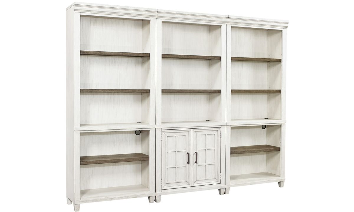 Upgrade your storage solutions with the Caraway Door Bookcase. With its aged ivory two-tone finish and adjustable shelves, this bookcase offers both style and functionality.