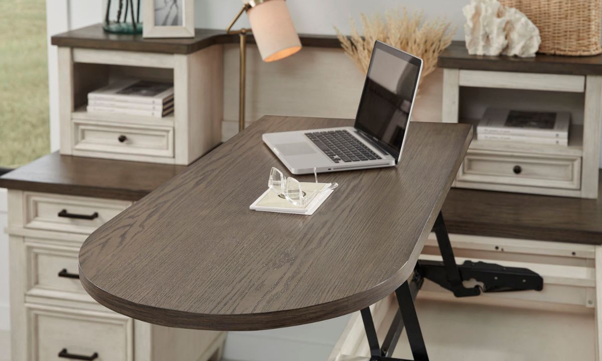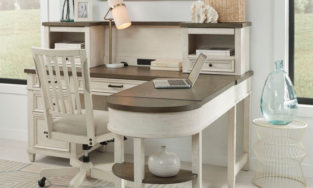 Transform your workspace into a functional and stylish environment with the Caraway Pedestal Desk with Hutch and Return. Crafted with an aged ivory two-tone finish and built with dovetail drawer joinery and full extension steel ball bearing glides, this desk offers both durability and elegance. The hutch provides additional storage and organization options with its grooved device holder trays, keeping your devices and accessories within easy reach. The adjustable lift top return adds versatility to your workspace, allowing you to customize the desk layout to fit your needs. Whether you're working from home or in a professional office, the Caraway Pedestal Desk with Hutch and Return is designed to enhance your productivity and efficiency. Upgrade your workspace today and experience the perfect combination of functionality and style.