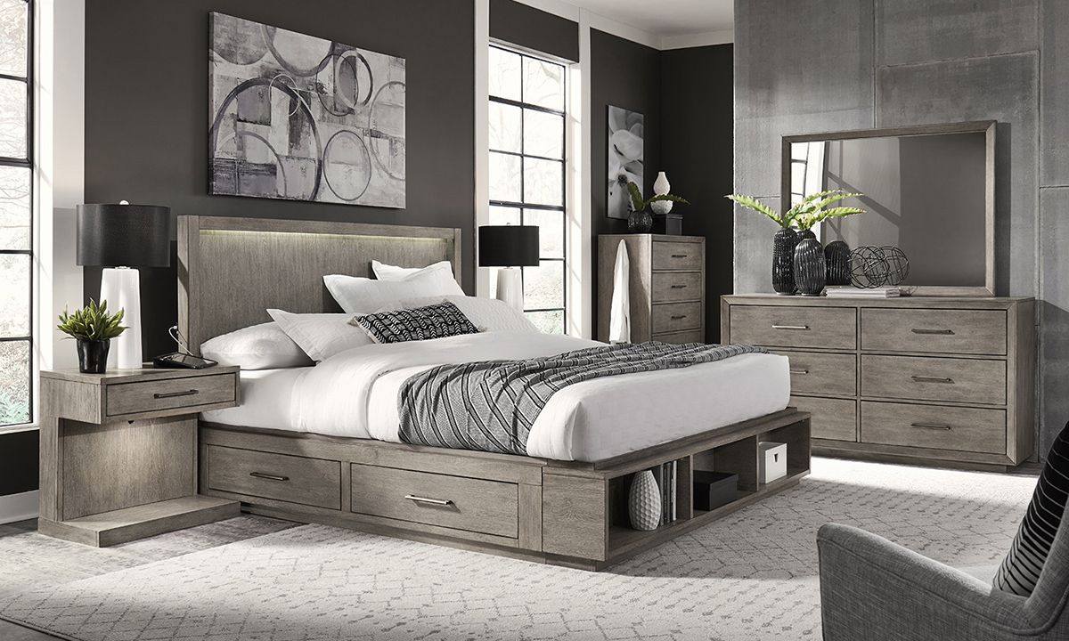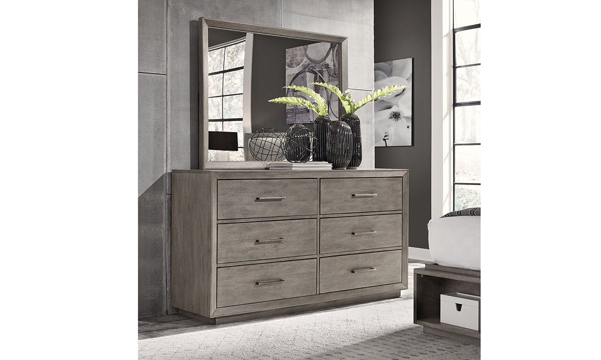 Complete your modern bedroom ensemble with the sleek design and straightforward utility of the Platinum Grey Linen 6-Drawer Dresser. Crafted for lasting resiliency from hardwood solids and organic Knotty Oak veneers, this 66-inch wide dresser is sealed in a contemporary Grey Linen wood finish to balance the angular silhouette. Six spacious storage drawers keep your zen den neat and organized while the felt-lined top drawers and cedar-lined bottom drawers ensure all your delicate clothing and jewelry are safely protected.