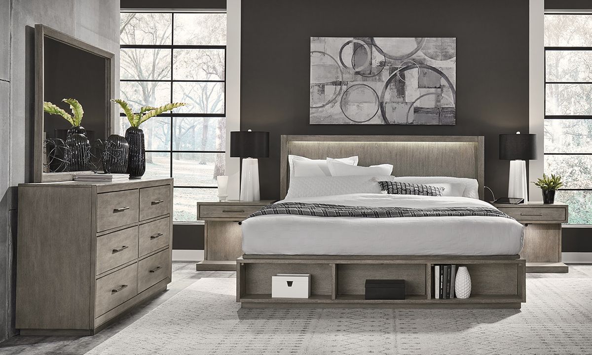 Ideal for reflecting natural lighting and visually opening up your living space, the Platinum Grey Linen Landscape Mirror is made to lend organic, modern looks in any application. Crafted from hardwood solids and Knotty Oak veneers, the 50-inch wide frame encasing this beveled glass mirror features a contemporary Grey Linen finish to balance the understated, angular profile. Pre-installed wire cable hardware on the back allows for easy vertical or horizontal wall-mounting in any room or attach it to the matching dresser for a tailored vanity look.