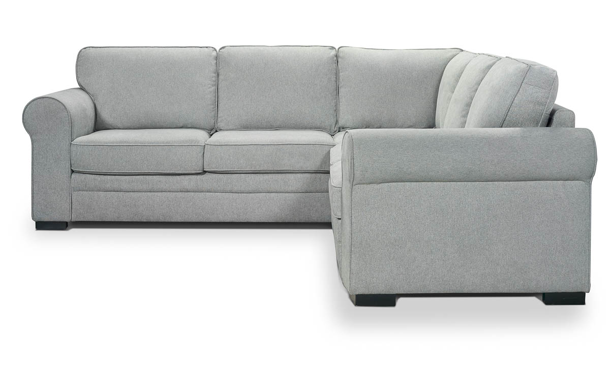 Casual two-piece sectional, with a hidden pop-up sleeper in the loveseat, features welted roll arms and versatile gray upholstery.
