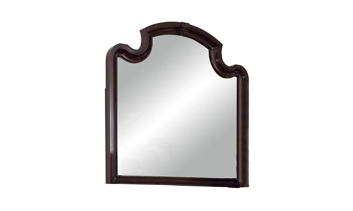 Hung on a wall as a classic decorative accent or attached to the matching dresser to create a stylish vanity, the Carnegie Manor Arched Mirror lends timeless elegance to any living space. The 47-inch wide beveled glass mirror features a dramatic arched peak, highlighted by the rich, Dark Cinnamon finish on the Prima Vera veneers. A bracelet of subtle acanthus leaf carvings at the top of the piece lend antique-inspired flair, for a timeless decorative accent that will add depth and character to any space.