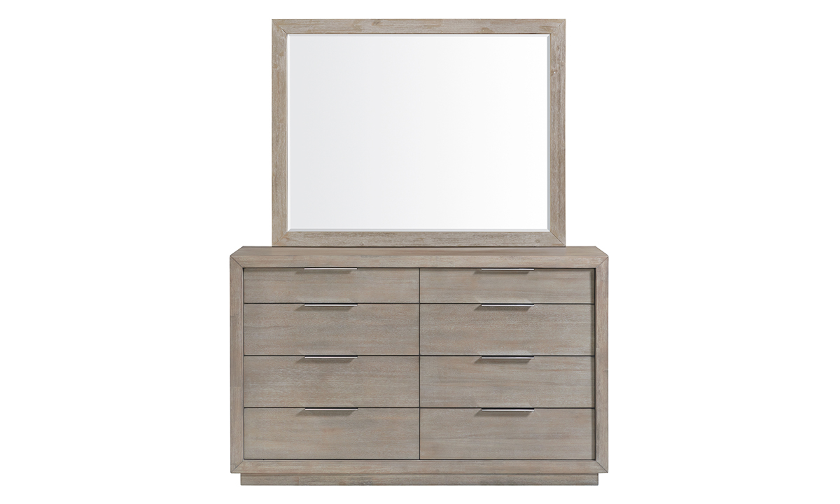 Add elegance to your bedroom with our Vanity Mirror, a perfect mirror for bedroom setups. Its fog gray finish and large landscape surface offer both style and functionality, crafted from high-quality Acacia solids and veneers. Designed to complement its matching dresser, this mirror enhances your daily routine with sophistication. Complete the set with this mirror today!