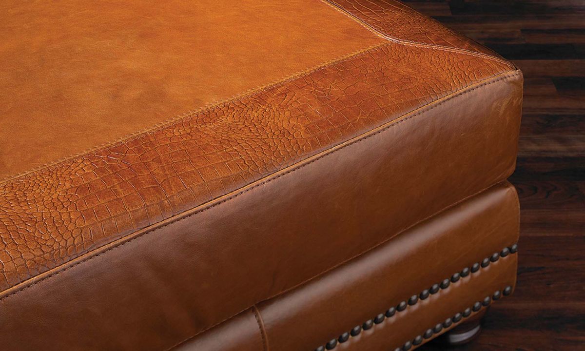 Give your décor a perfect companion piece with the durable construction and worldly appeal of this charming cocktail ottoman. The perfect addition to any space, this 100% top grain leather cocktail ottoman is accented in decorative stitching, nail head trim and subtle, alligator hide embossing to give it that worldly appealed. Use it as a textural cocktail table, impromptu extra seating or kick back and prop up your feet to enjoy the quality craftmanship and comfort.