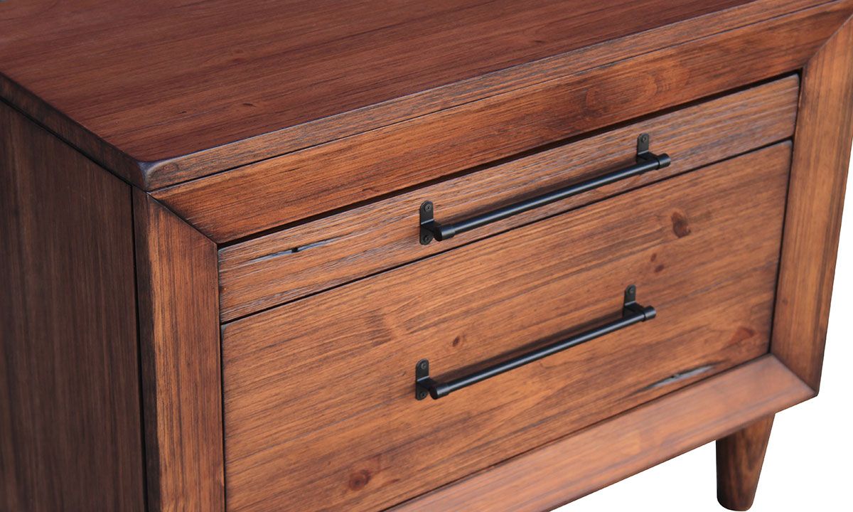 Small in stature but big in style, the Denver 2-Drawer Nightstand from Rotta Furniture blends natural Brazilian Pine with modern design and conveniences to create an essential bedside companion. The resilient Brazilian Pine hardwoods and warm Brushed Brown finish on the 30-inch nightstand provides a rustic contrast to the modern picture-frame border around the drawers and tapered wood legs. Natural graining in the woodwork and industrial metal bar-pull hardware complement to the unique natural finish while the built-in felt-lined organizer in the top drawer adds convenient functionality.