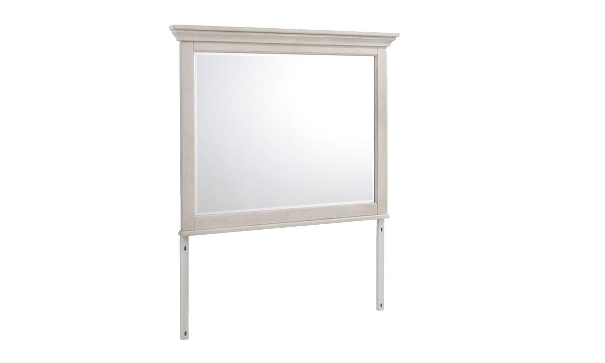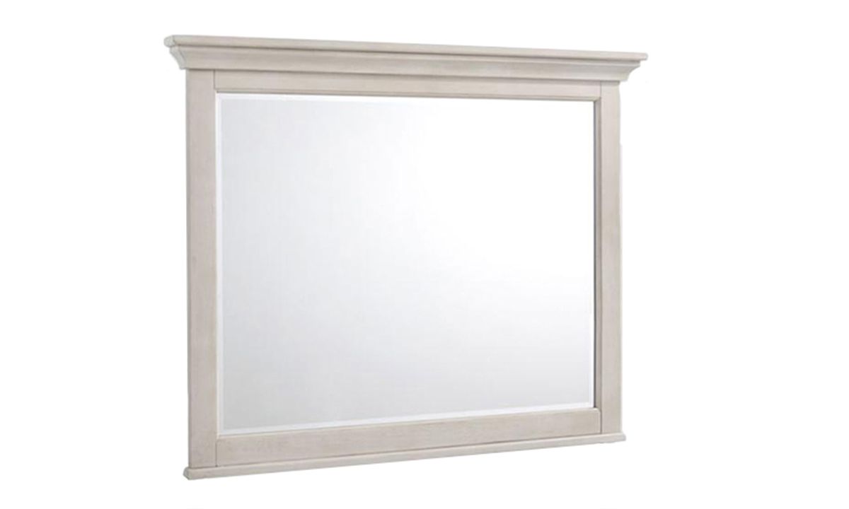 A welcome addition to a living room, entry hall or bedroom, the San Mateo White Arts & Crafts Landscape Mirror can be hung on a wall or attached to the coordinating San Mateo Dresser for endless versatility. Timeless in design and craftsmanship, the beveled glass mirror is bordered by an understated frame crafted from Rubberwood and solid Hardwoods. Classic crown molding and a distressed Coastal White finish lend an invitingly rustic feel and polished look to the accent piece that will elevate the look of any living space.