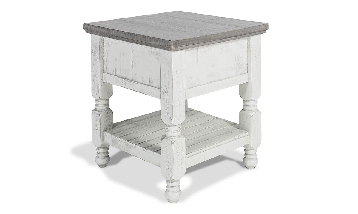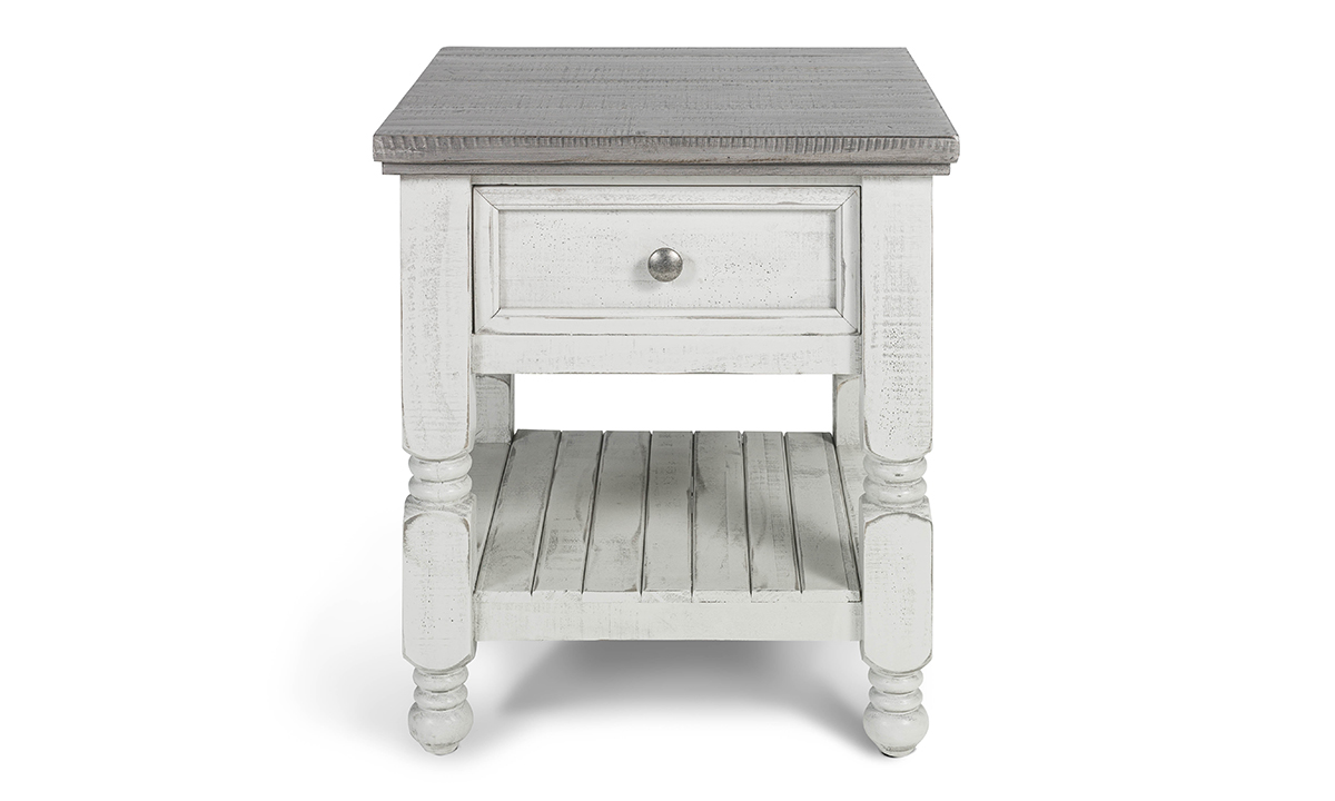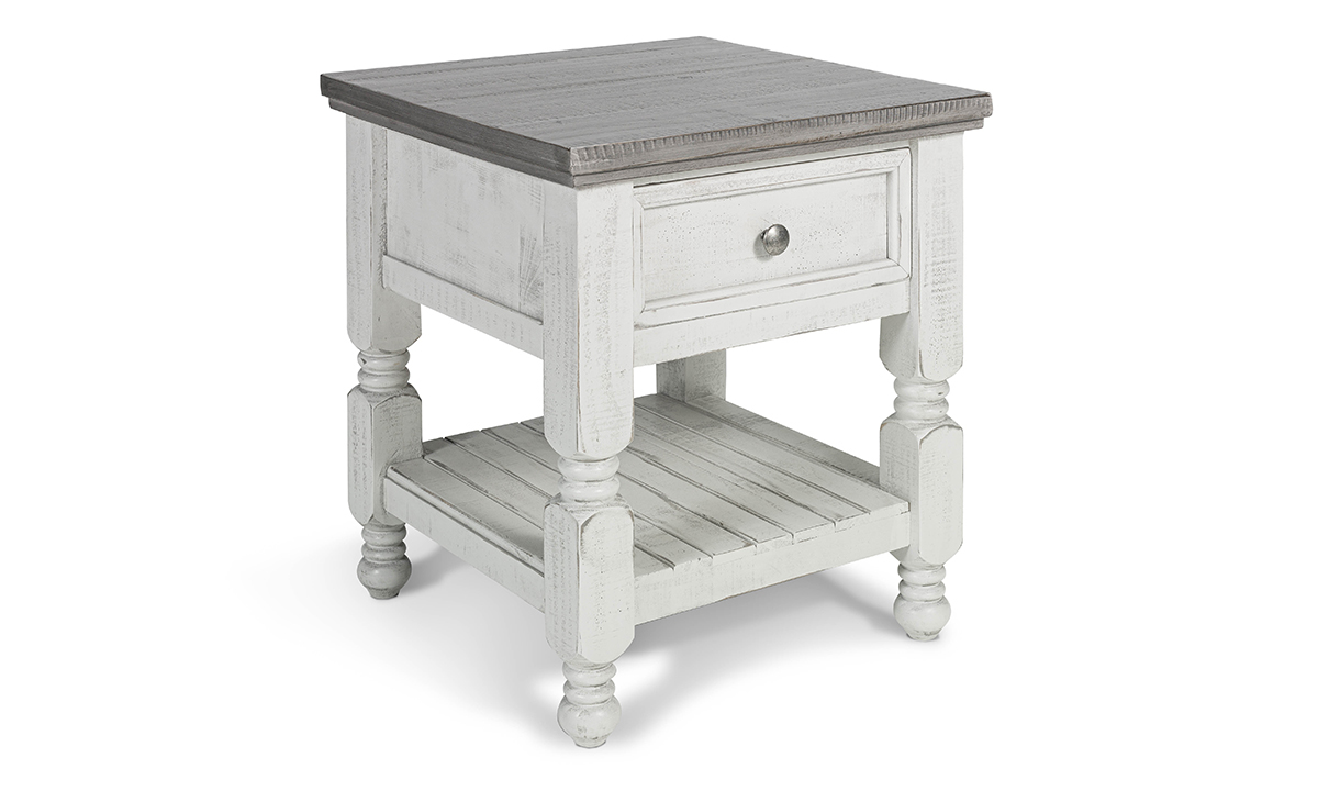 Whether you are adding to an existing ensemble or completing the Sage White collection, the Sage White 1-Drawer End Table puts an inviting finish touch on any living space. Crafted to last from solid Pine, this versatile 23-inch end table features an upper storage shelf and plank-style tabletop above a slatted open shelf. Inspired by traditional farmhouse tables, the weathered grey and ivory wood finish lends a relaxed feel to the angular profile to feel right at home in a range of décor, from coastal cottage, to traditional, to modern farmhouse.