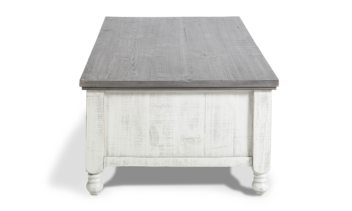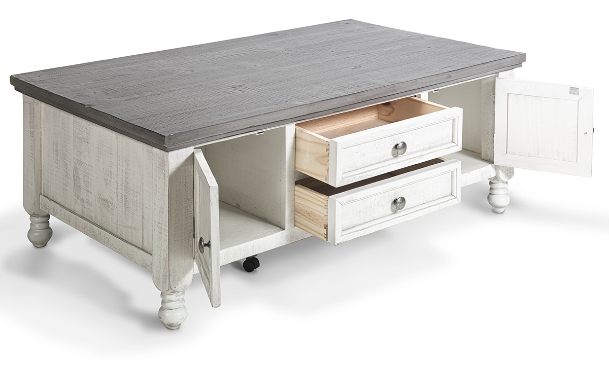 Elevate your living room ensemble with the classic, lived-in style of the Sage White 4-Drawer Cocktail Table. Crafted to last from solid Pine, this versatile 50-inch coffee table feature a traditional plank-style surface design and charming framed door fronts. Inspired by traditional farmhouse tables, the weathered grey and ivory wood finish lends a relaxed feel to the angular profile to feel right at home in a range of décor, from coastal cottage, to traditional, to modern farmhouse. Rolling casters tucked on the underside of each leg make repositioning the table a breeze while the four storage drawers and four storage cabinets (two on each side) keep all your living room essentials neatly tucked away.