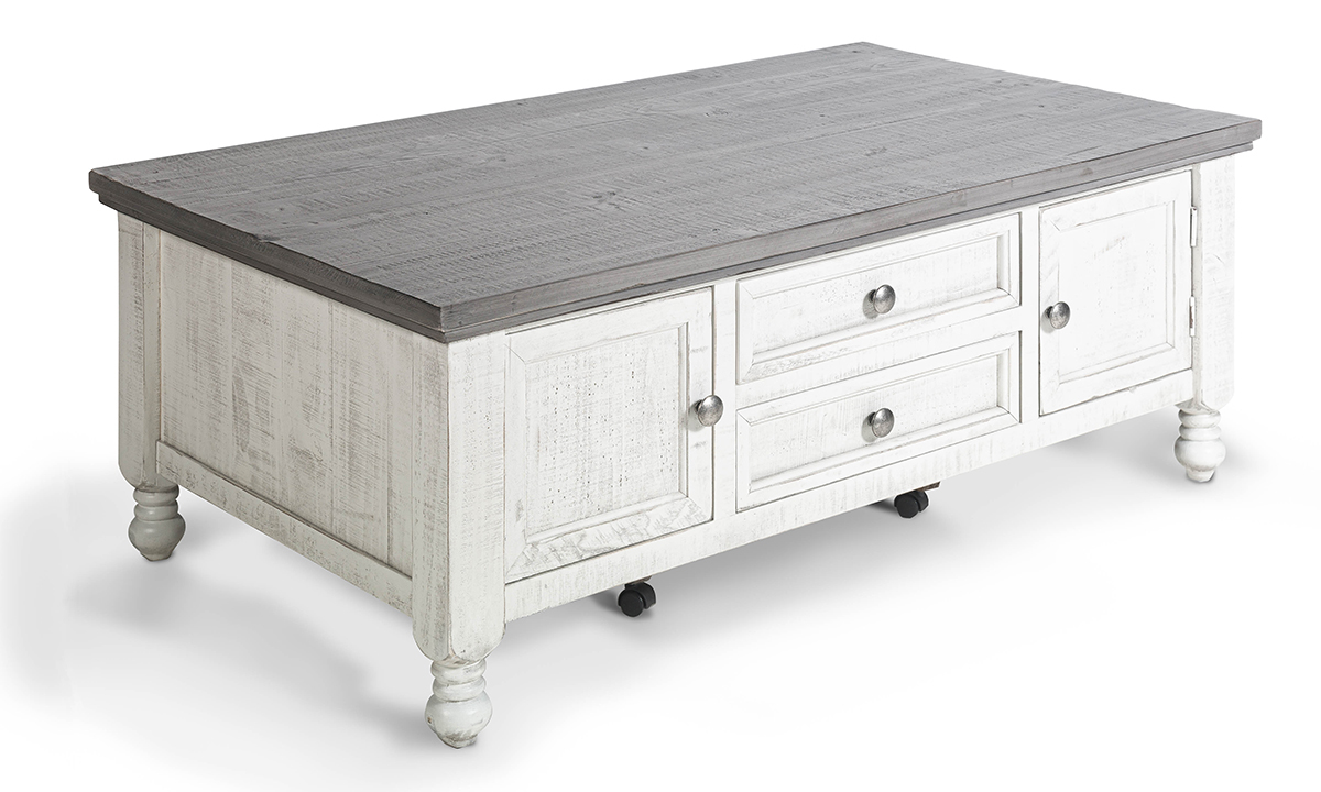 A weathered Ivory and Grey wood finish lends laid-back charm to this functional coffee table featuring four storage drawers and four cabinets.