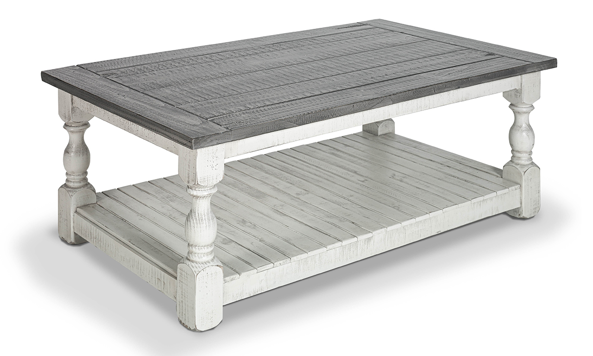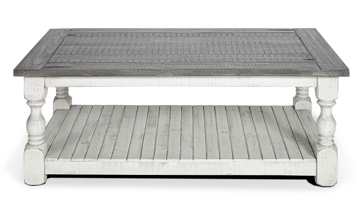 Elevate your living room ensemble with the classic, lived-in style of the Sage White Cocktail Table. Crafted to last from solid Pine, this versatile 54-inch coffee table features a slatted wood shelf, traditional planked surface and timeless turned wood legs. Inspired by traditional farmhouse tables, the weathered grey and ivory wood finish lends a relaxed feel to the angular profile to feel right at home in a range of décor, from coastal cottage, to traditional, to modern farmhouse. Rolling casters tucked on the underside of each leg make repositioning the table a breeze, perfect for rearranging your space or accommodating for get-togethers.