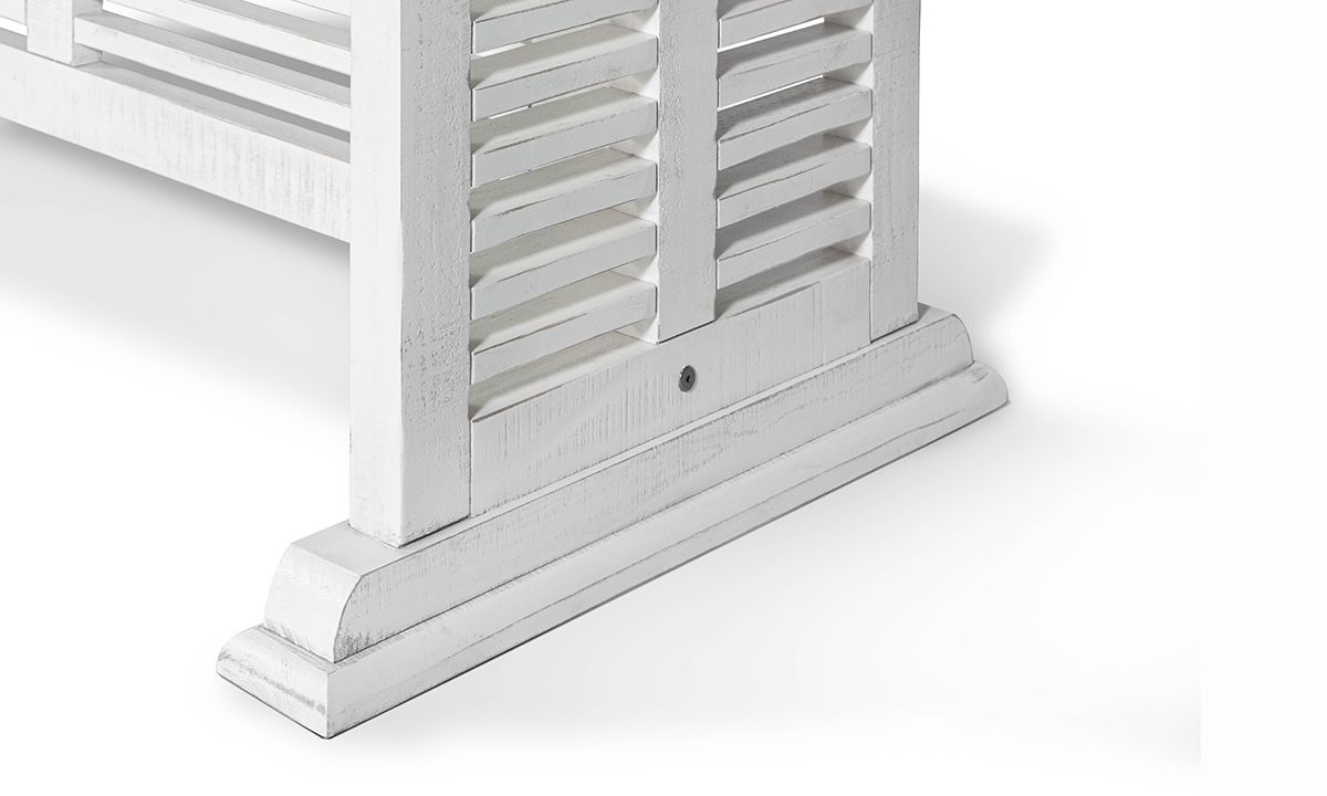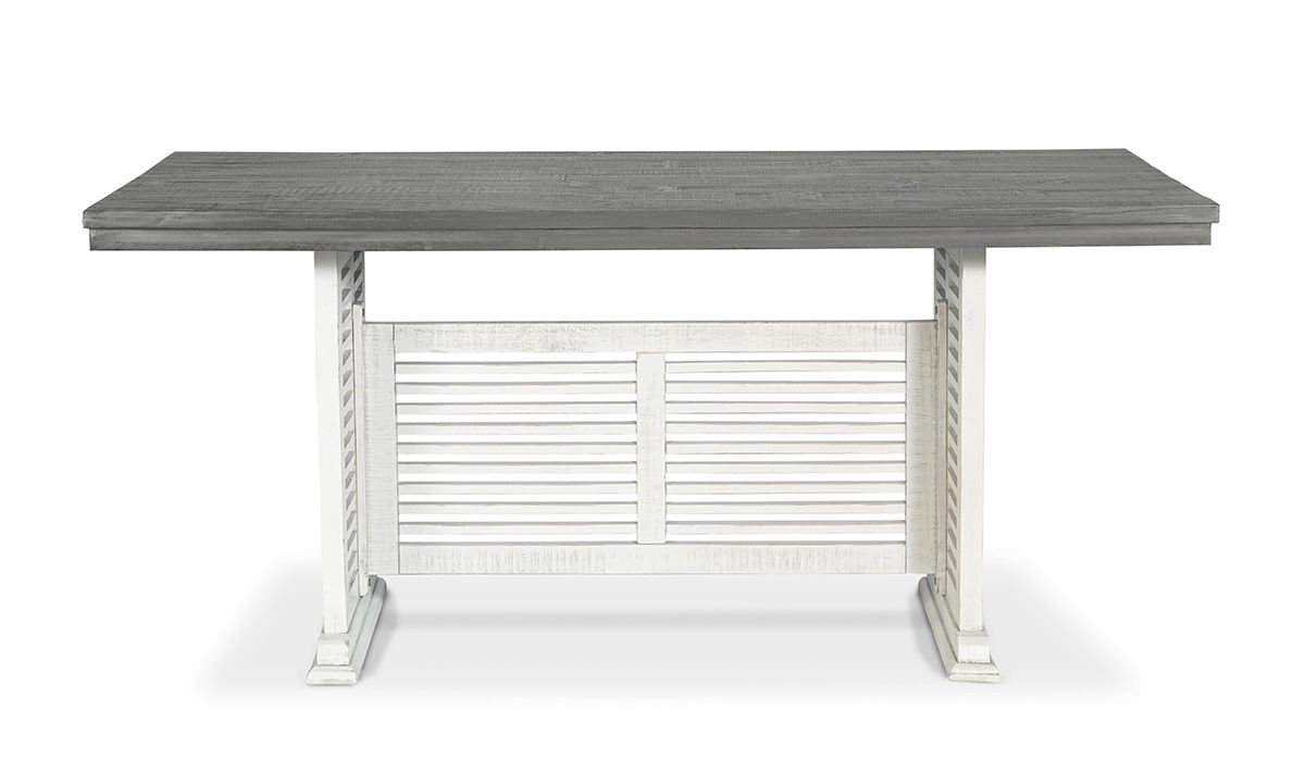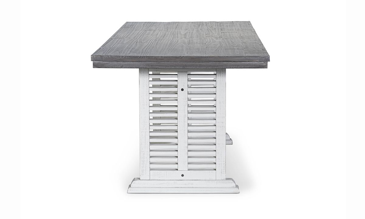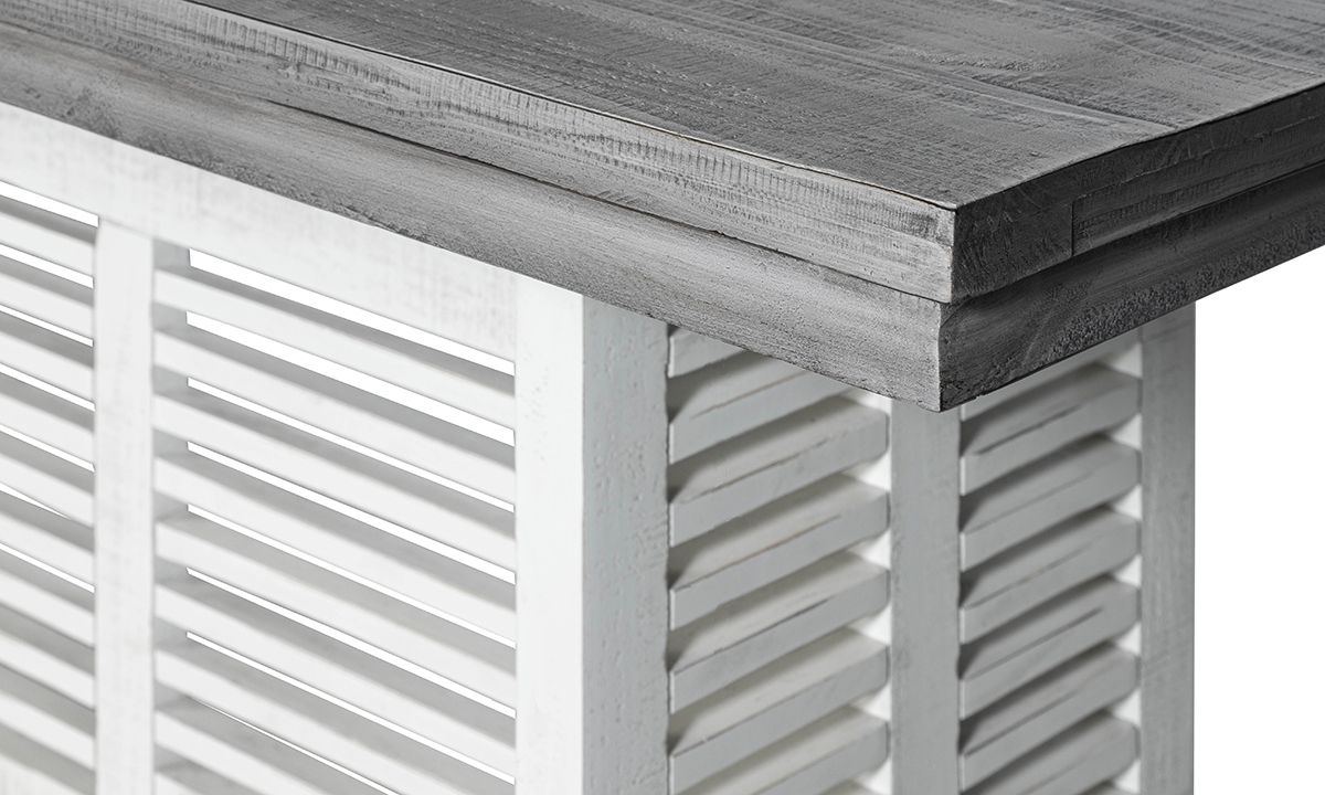 Create a kitchen or dining room focal point designed to impress with the unique design and inviting styling of the Sage White Counter Height Dining Table. Marrying contemporary, farmhouse, coastal and transitional styles, the table base features a mesmerizing linear slat-wood design in a distressed ivory wood finish beneath a rustic planked wood top in a contemporary grey finish, the two-tone look reminiscent of classic farmhouse tables.