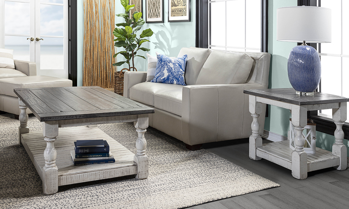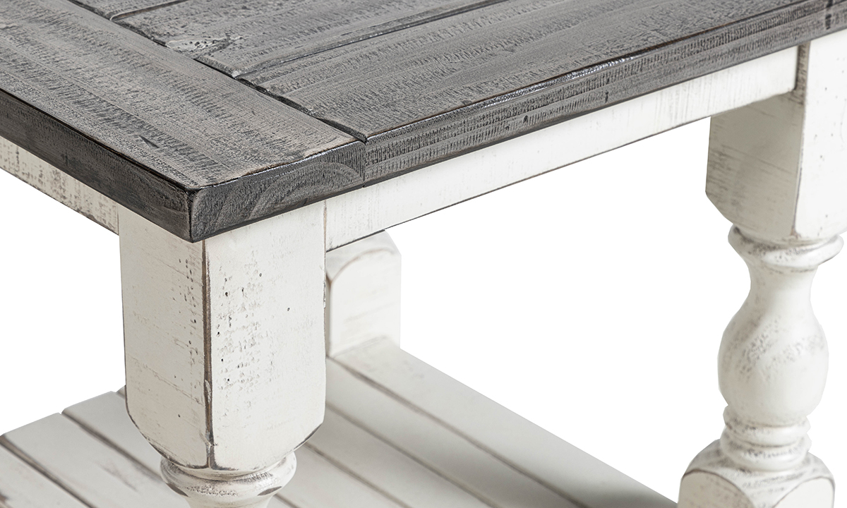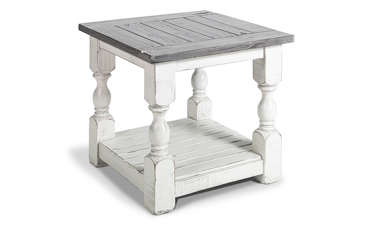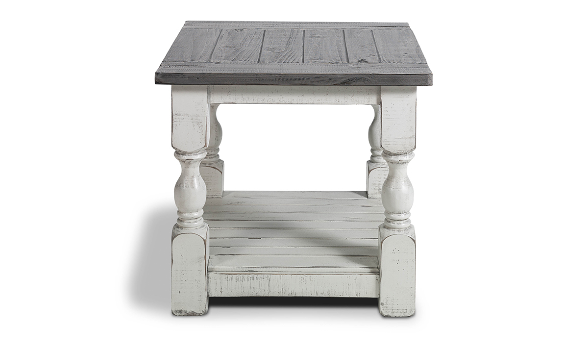 Whether you are adding to an existing ensemble or completing the Sage White collection, the Sage White End Table puts an inviting finish touch on any living space. Crafted to last from solid Pine, this versatile 26-inch end table features a slatted wood shelf, traditional planked surface and timeless turned wood legs. Inspired by traditional farmhouse tables, the weathered grey and ivory wood finish lends a relaxed feel to the angular profile to feel right at home in a range of décor, from coastal cottage, to traditional, to modern farmhouse.